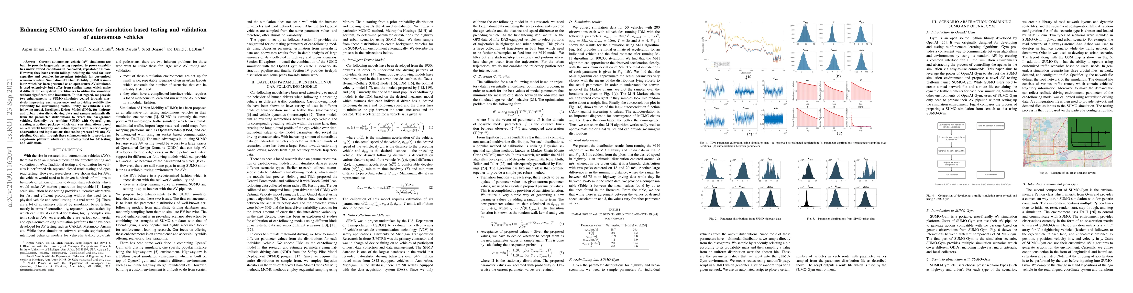 This paper enhances the SUMO simulator to improve its usability for autonomous vehicle testing by calibrating a car-following model for realistic traffic and integrating it with OpenAI gym for easy scenario creation and simulation. The goal is to create a user-friendly platform for AV validation.