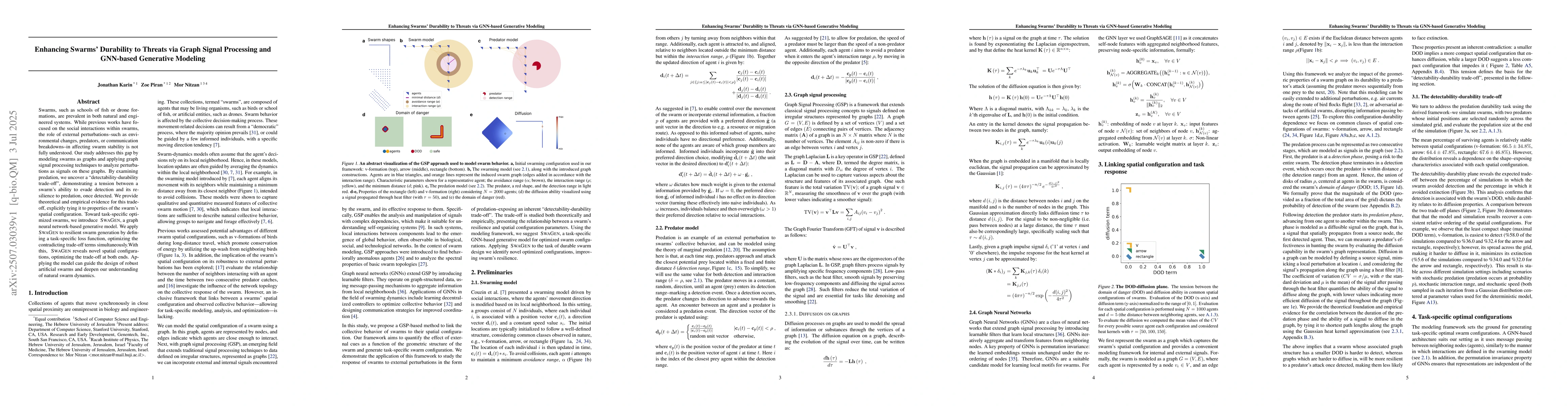 Swarms, such as schools of fish or drone formations, are prevalent in both natural and engineered systems. While previous works have focused on the social interactions within swarms, the role of external perturbations--such as environmental changes, predators, or communication breakdowns--in affecting swarm stability is not fully understood. Our study addresses this gap by modeling swarms as graphs and applying graph signal processing techniques to analyze perturbations as signals on these graphs. By examining predation, we uncover a "detectability-durability trade-off", demonstrating a tension between a swarm's ability to evade detection and its resilience to predation, once detected. We provide theoretical and empirical evidence for this trade-off, explicitly tying it to properties of the swarm's spatial configuration. Toward task-specific optimized swarms, we introduce SwaGen, a graph neural network-based generative model. We apply SwaGen to resilient swarm generation by defining a task-specific loss function, optimizing the contradicting trade-off terms simultaneously.With this, SwaGen reveals novel spatial configurations, optimizing the trade-off at both ends. Applying the model can guide the design of robust artificial swarms and deepen our understanding of natural swarm dynamics.
