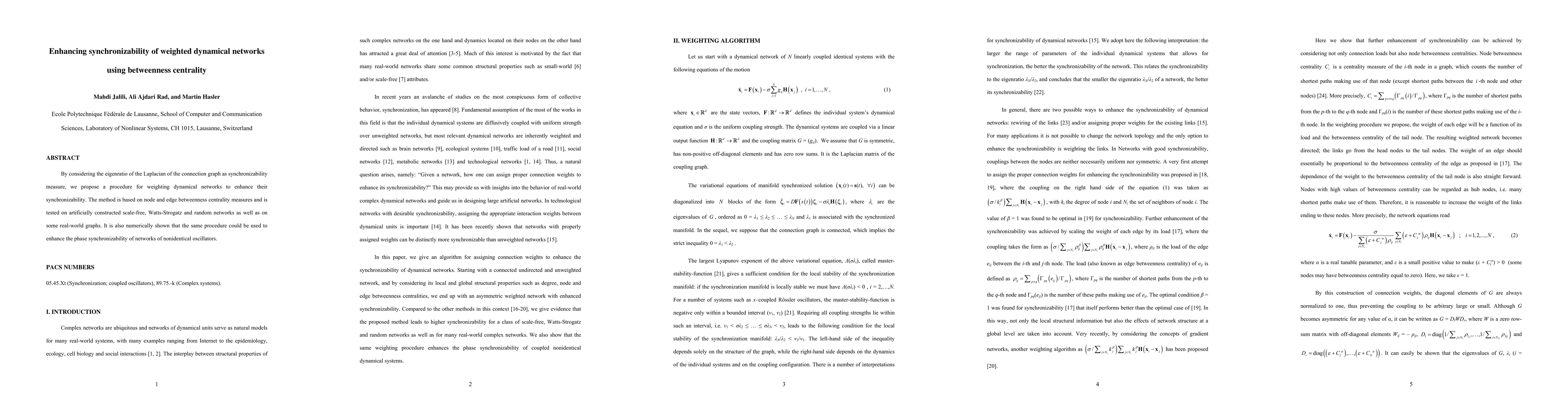 This paper proposes a method to enhance synchronizability in weighted dynamical networks using node and edge betweenness centrality measures. The approach is tested on various network types and shown to improve phase synchronizability for networks of nonidentical oscillators.