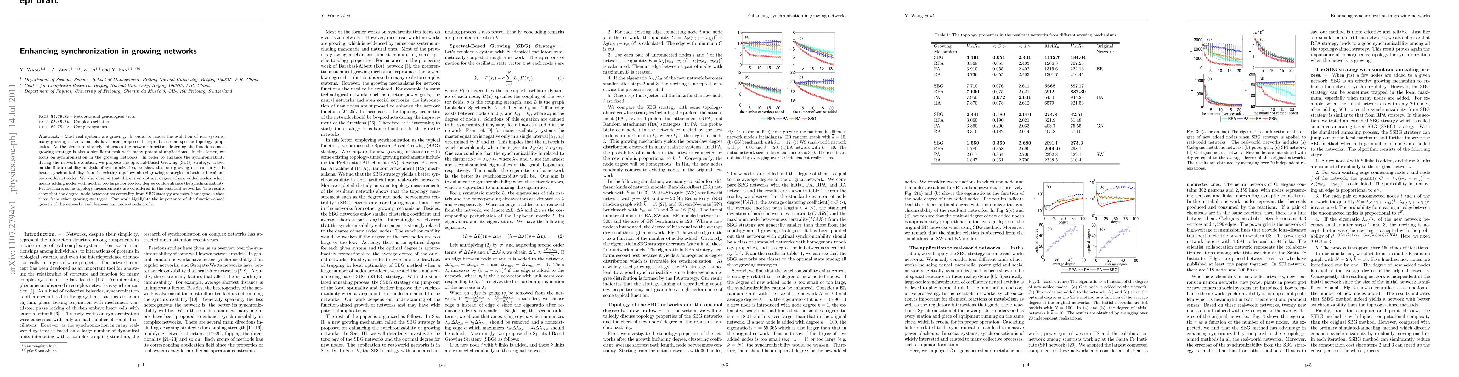 This paper proposes a Spectral-Based Growing (SBG) strategy to enhance synchronization in evolving networks, demonstrating that it outperforms existing topology-focused strategies. The study finds an optimal degree for new nodes to maintain better synchronizability and shows that SBG results in more homogeneous network topology measurements.