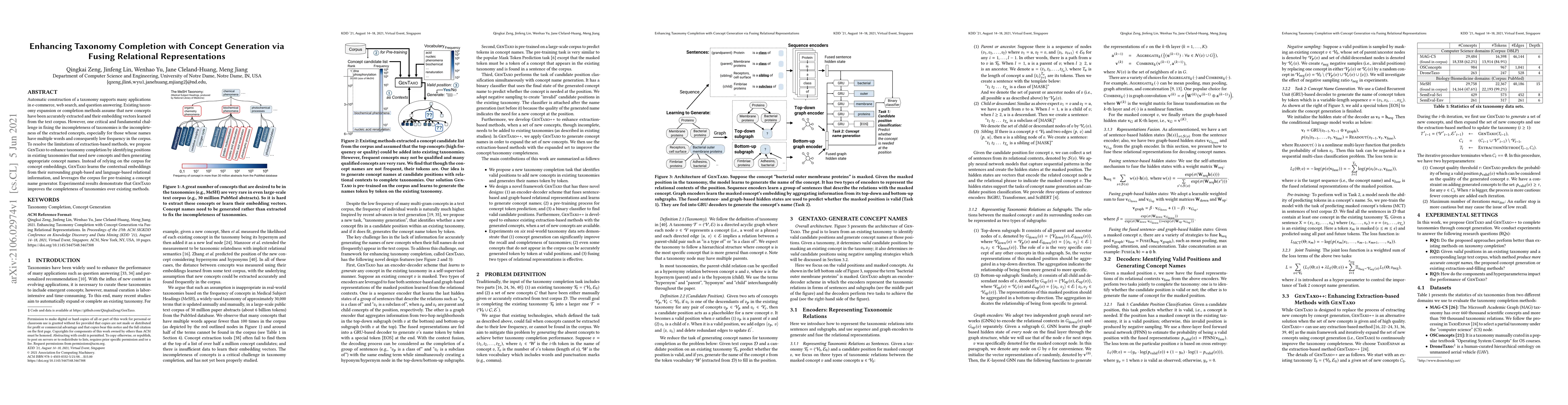 The paper proposes GenTaxo, a method to enhance taxonomy completion by generating new concepts based on relational representations rather than relying solely on low-frequency concept extraction from text corpora. GenTaxo improves taxonomy completeness by leveraging contextual embeddings from relational information and pre-training a concept name generator using a corpus.