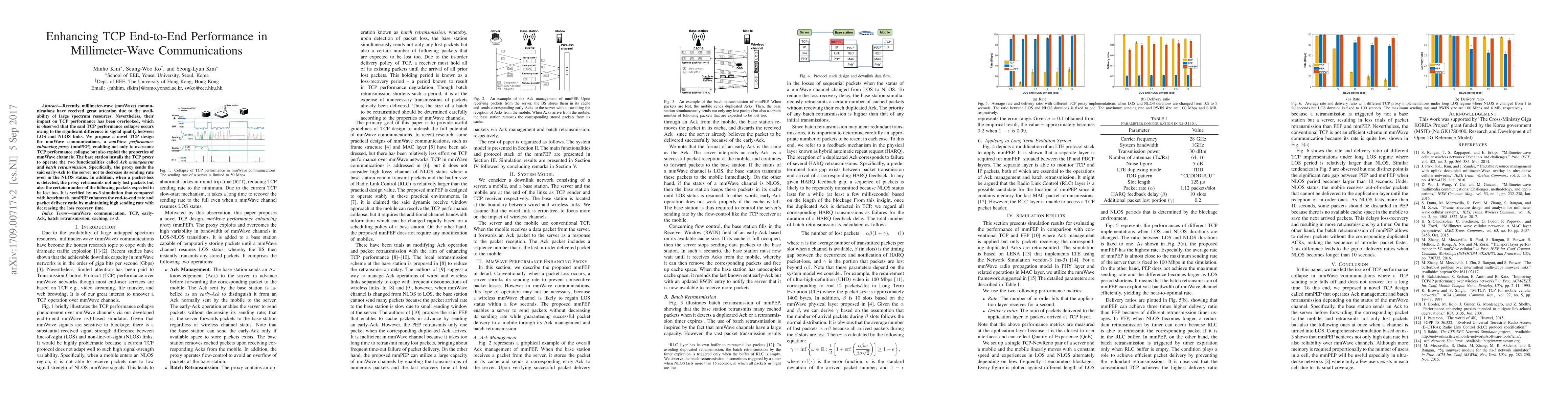 This paper proposes a novel TCP design, mmWave performance enhancing proxy (mmPEP), to improve TCP performance in millimeter-wave communications by addressing signal quality differences between LOS and NLOS links. The proxy implements Ack management and batch retransmission to maintain high sending rates and reduce loss recovery time, enhancing end-to-end rate and packet delivery ratio.