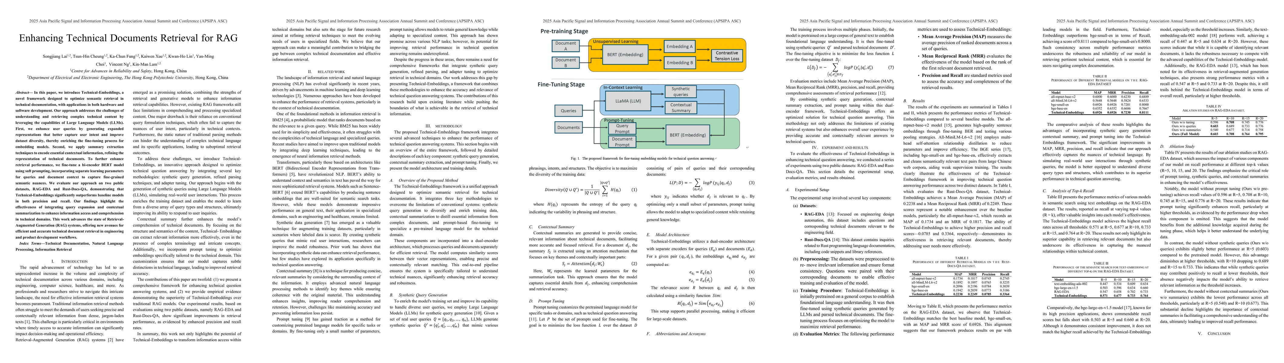 In this paper, we introduce Technical-Embeddings, a novel framework designed to optimize semantic retrieval in technical documentation, with applications in both hardware and software development. Our approach addresses the challenges of understanding and retrieving complex technical content by leveraging the capabilities of Large Language Models (LLMs). First, we enhance user queries by generating expanded representations that better capture user intent and improve dataset diversity, thereby enriching the fine-tuning process for embedding models. Second, we apply summary extraction techniques to encode essential contextual information, refining the representation of technical documents. To further enhance retrieval performance, we fine-tune a bi-encoder BERT model using soft prompting, incorporating separate learning parameters for queries and document context to capture fine-grained semantic nuances. We evaluate our approach on two public datasets, RAG-EDA and Rust-Docs-QA, demonstrating that Technical-Embeddings significantly outperforms baseline models in both precision and recall. Our findings highlight the effectiveness of integrating query expansion and contextual summarization to enhance information access and comprehension in technical domains. This work advances the state of Retrieval-Augmented Generation (RAG) systems, offering new avenues for efficient and accurate technical document retrieval in engineering and product development workflows.