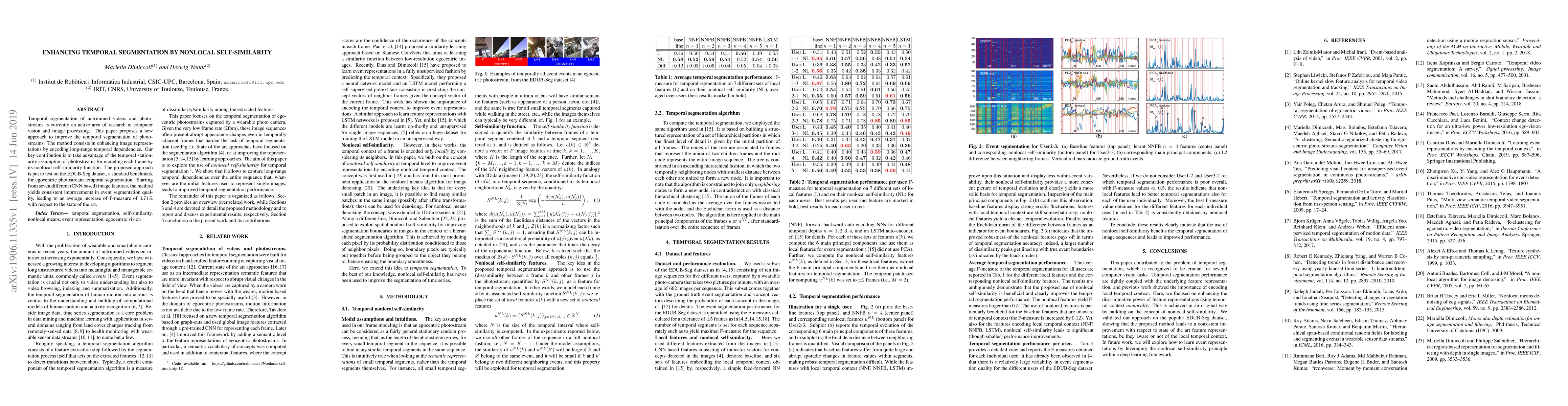 Temporal segmentation of untrimmed videos and photo-streams is currently an active area of research in computer vision and image processing. This paper proposes a new approach to improve the temporal segmentation of photo-streams. The method consists in enhancing image representations by encoding long-range temporal dependencies. Our key contribution is to take advantage of the temporal stationarity assumption of photostreams for modeling each frame by its nonlocal self-similarity function. The proposed approach is put to test on the EDUB-Seg dataset, a standard benchmark for egocentric photostream temporal segmentation. Starting from seven different (CNN based) image features, the method yields consistent improvements in event segmentation quality, leading to an average increase of F-measure of 3.71% with respect to the state of the art.