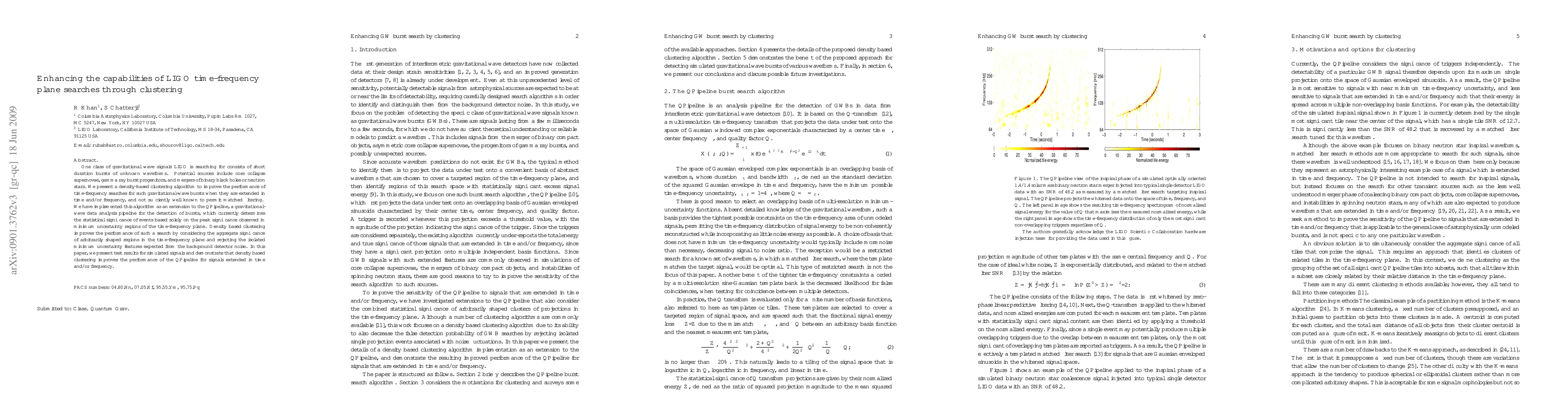 This paper introduces a density-based clustering algorithm to enhance LIGO's time-frequency searches for short, unknown gravitational-wave signals from sources like supernovae, gamma-ray bursts, and binary black hole/neutron star mergers. The method improves search performance by considering the collective significance of time-frequency regions, reducing false positives from detector noise, and has been successfully tested with simulated signals.