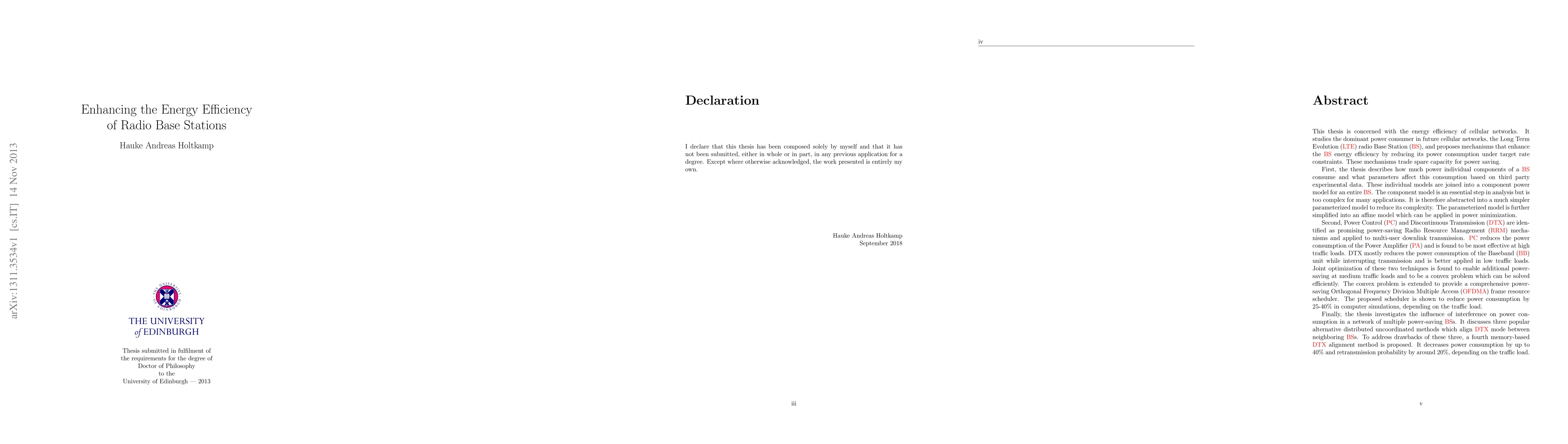 This thesis is concerned with the energy efficiency of cellular networks. It studies the dominant power consumer in future cellular networks, the Long Term Evolution radio base stations (BS), and proposes mechanisms that enhance the BS energy efficiency by reducing its power consumption under target rate constraints. These mechanisms trade spare capacity for power saving.