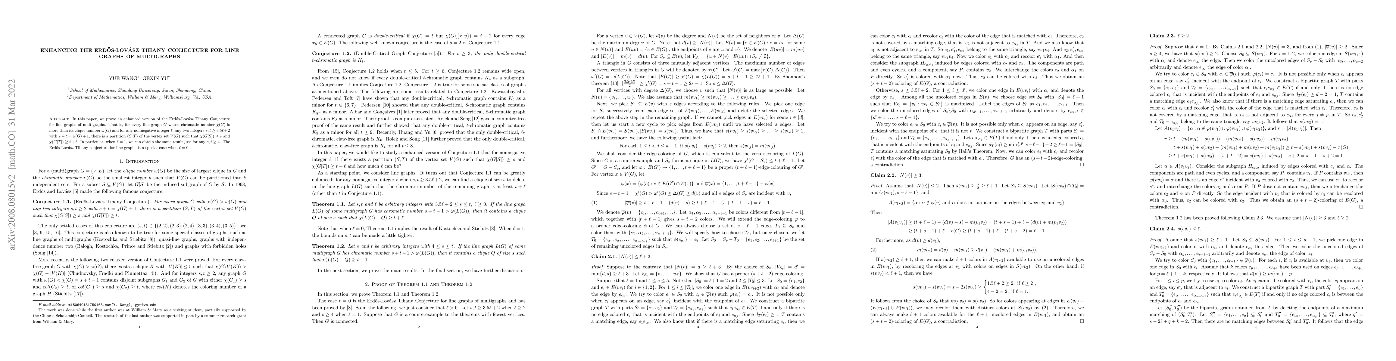 This paper proves an enhanced version of the Erdős-Lovász Tihany Conjecture for line graphs of multigraphs, showing that for certain conditions on chromatic and clique numbers, a partition of the graph's vertices can achieve specified chromatic properties. The conjecture is a special case when $\ell=0$.