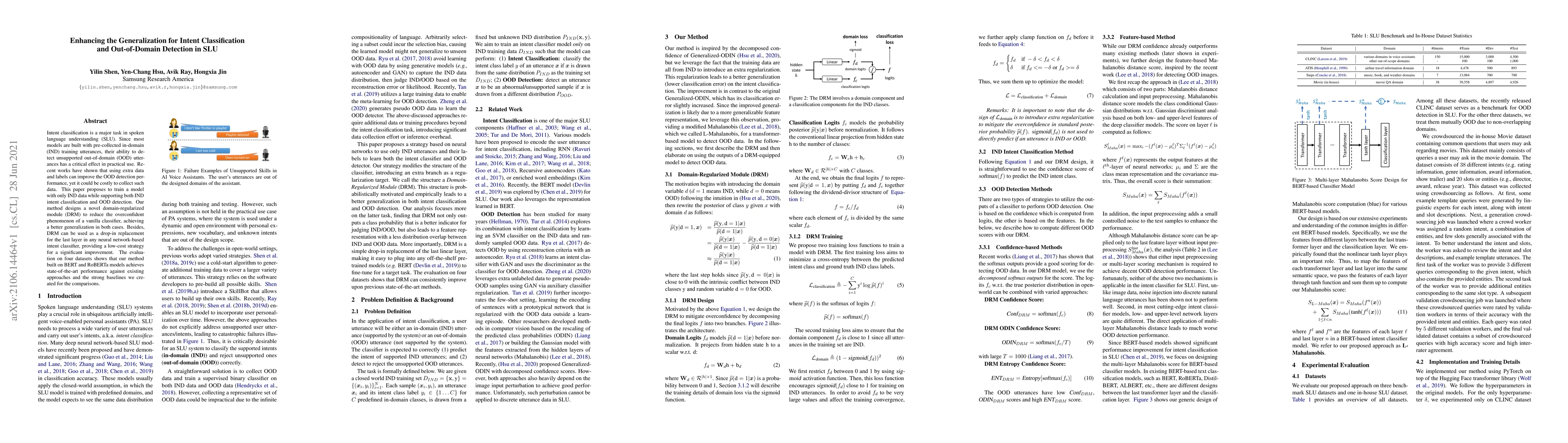 This paper proposes a domain-regularized module (DRM) to enhance intent classification and out-of-domain detection in spoken language understanding (SLU) using only in-domain training data. The DRM improves model generalization and achieves state-of-the-art performance on multiple datasets.