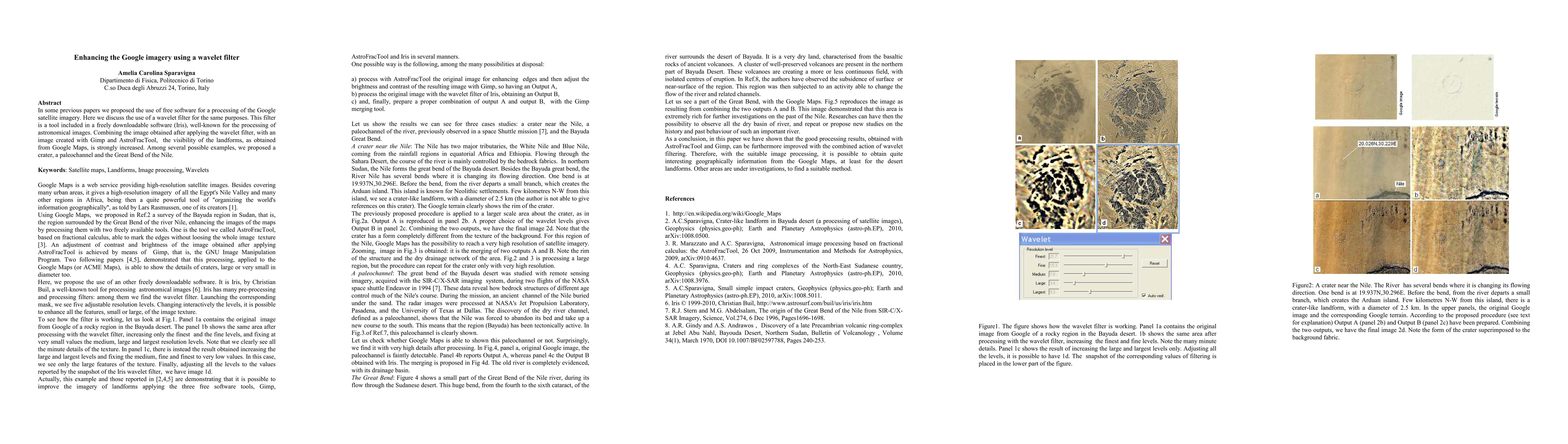 In some previous papers we proposed the use of free software for a processing of the Google satellite imagery. Here we discuss the use of a wavelet filter for the same purposes. This filter is a tool included in a freely downloadable software (Iris), well-known for the processing of astronomical images. Combining the image obtained after applying the wavelet filter, with an image created with Gimp and AstroFracTool, the visibility of the landforms, as obtained from Google Maps, is strongly increased. Among several possible examples, we proposed a crater, a paleochannel and the Great Bend of the Nile.