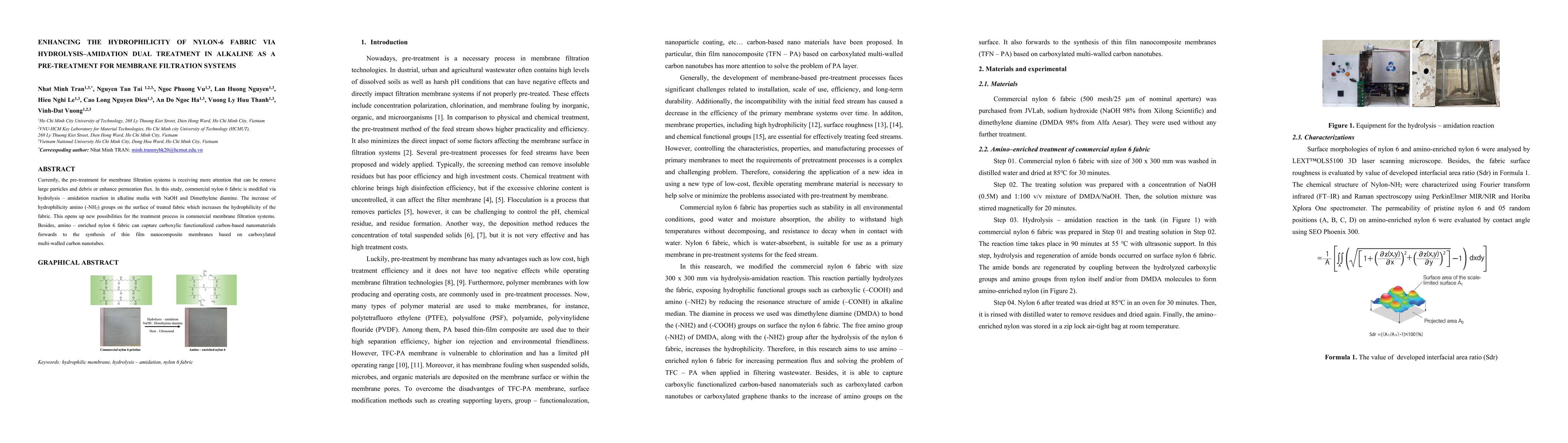 Currently, the pre-treatment for membrane filtration systems is receiving more attention that can be remove large particles and debris or enhance permeation flux. In this study, commercial nylon 6 fabric is modified via hydrolysis amidation reaction in alkaline media with NaOH and Dimethylene diamine. The increase of hydrophilicity amino groups on the surface of treated fabric which increases the hydrophilicity of the fabric. This opens up new possibilities for the treatment process in commercial membrane filtration systems. Besides, amino enriched nylon 6 fabric can capture carboxylic functionalized carbon-based nanomaterials forwards to the synthesis of thin film nanocomposite membranes based on carboxylated multi-walled carbon nanotubes.
