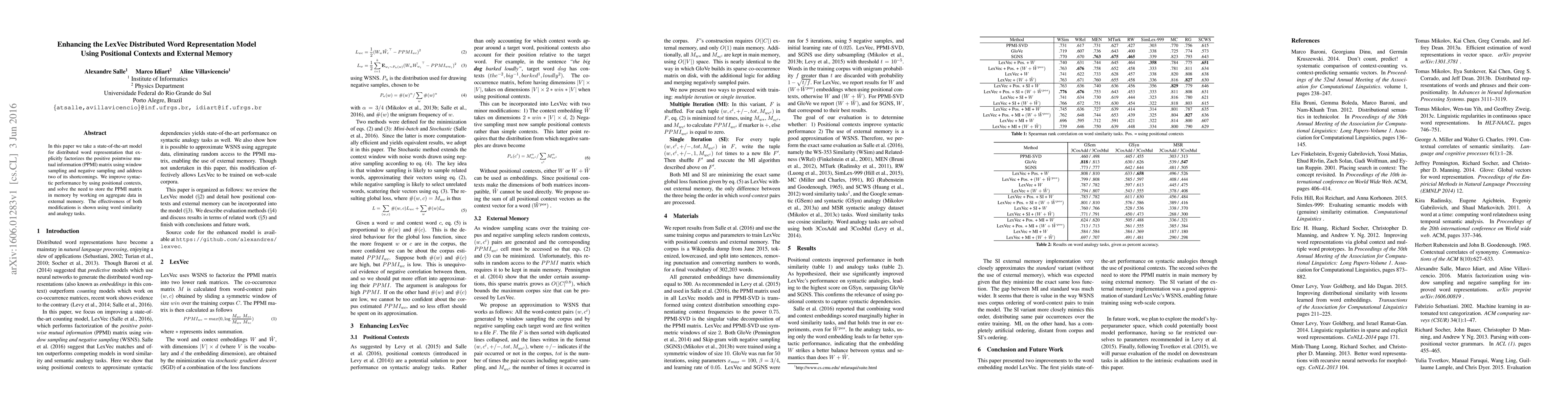 This paper enhances the LexVec model by incorporating positional contexts to improve syntactic performance and utilizing external memory to manage the PPMI matrix, demonstrating effectiveness through word similarity and analogy tasks.