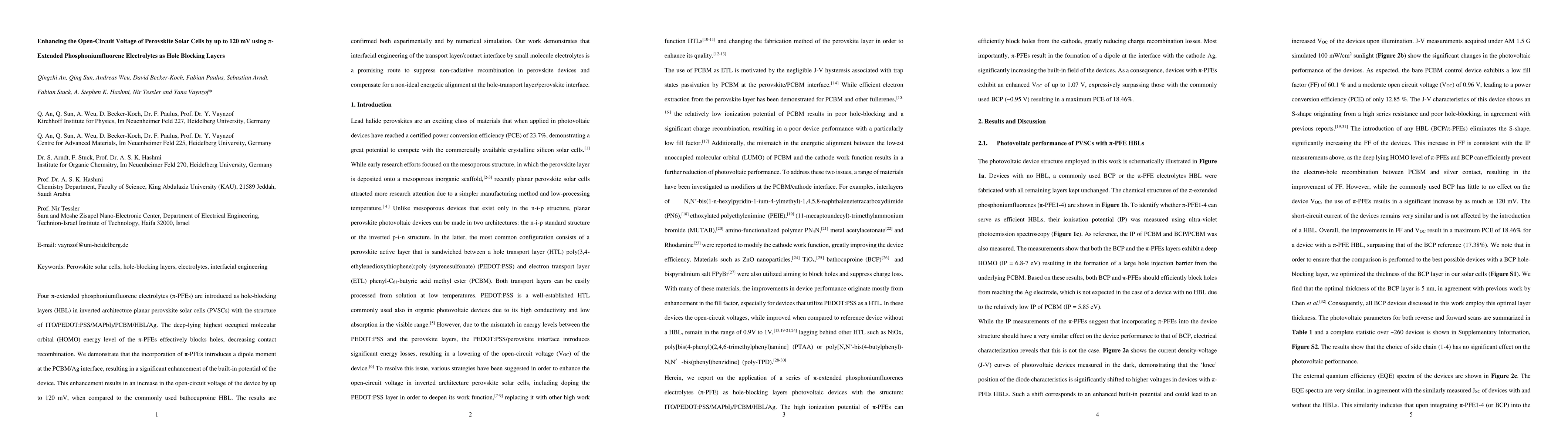 Researchers improved perovskite solar cells by up to 120 mV using a special electrolyte that blocks holes, increasing the device's efficiency.