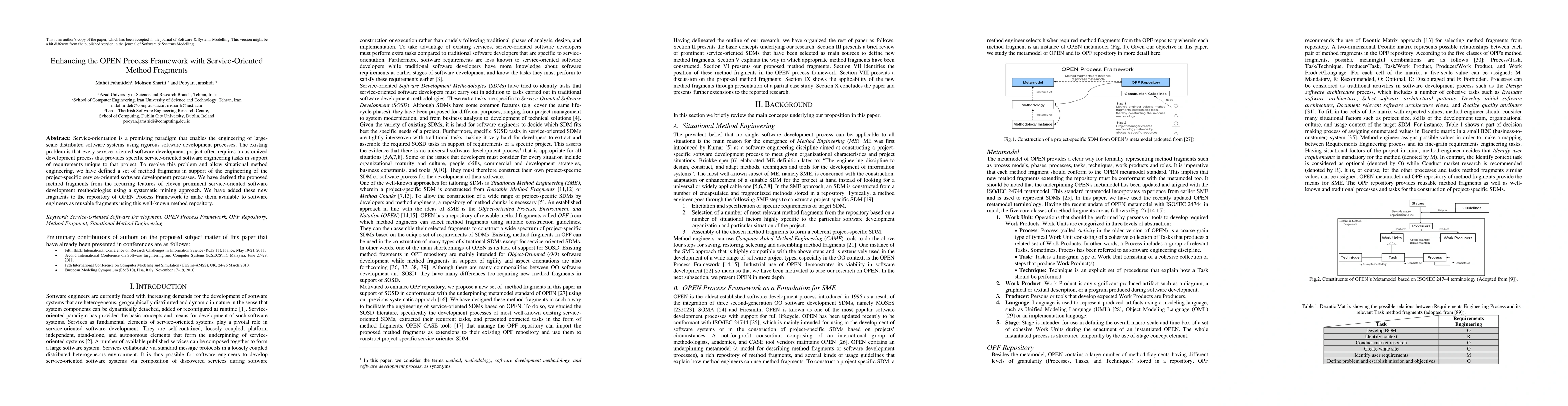 This paper proposes enhancing the OPEN Process Framework by integrating reusable method fragments derived from prominent service-oriented software development methodologies. These fragments aim to support situational method engineering, allowing for customized development processes tailored to specific project requirements.