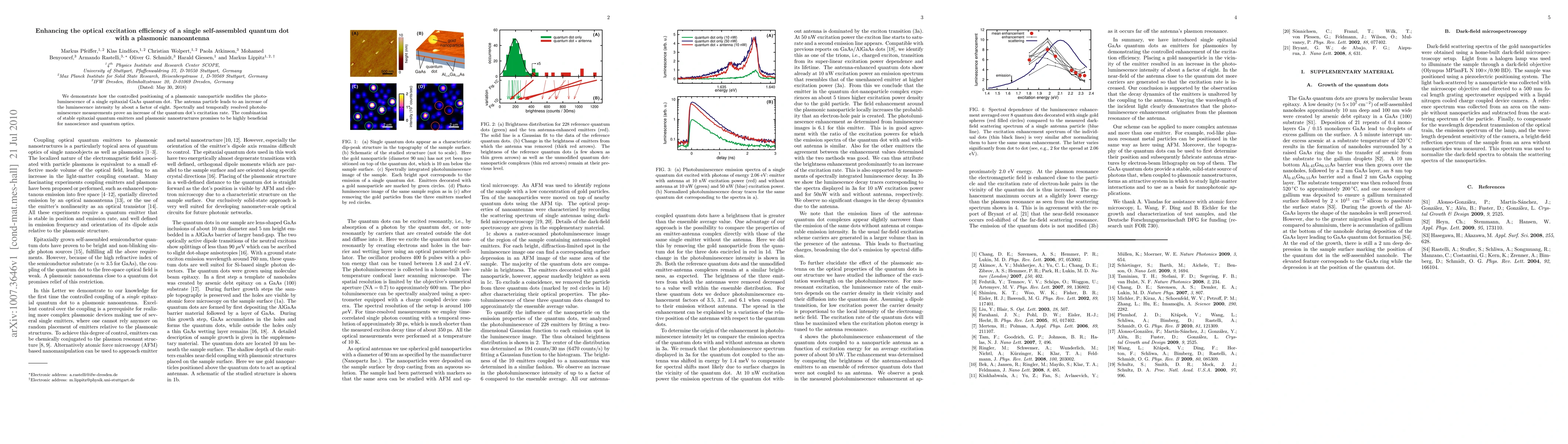 This paper shows that positioning a plasmonic nanoparticle near an epitaxial GaAs quantum dot enhances its photoluminescence by a factor of eight, indicating a higher excitation rate. The integration of quantum emitters with plasmonic nanostructures holds significant potential for advancements in nanoscience and quantum optics.