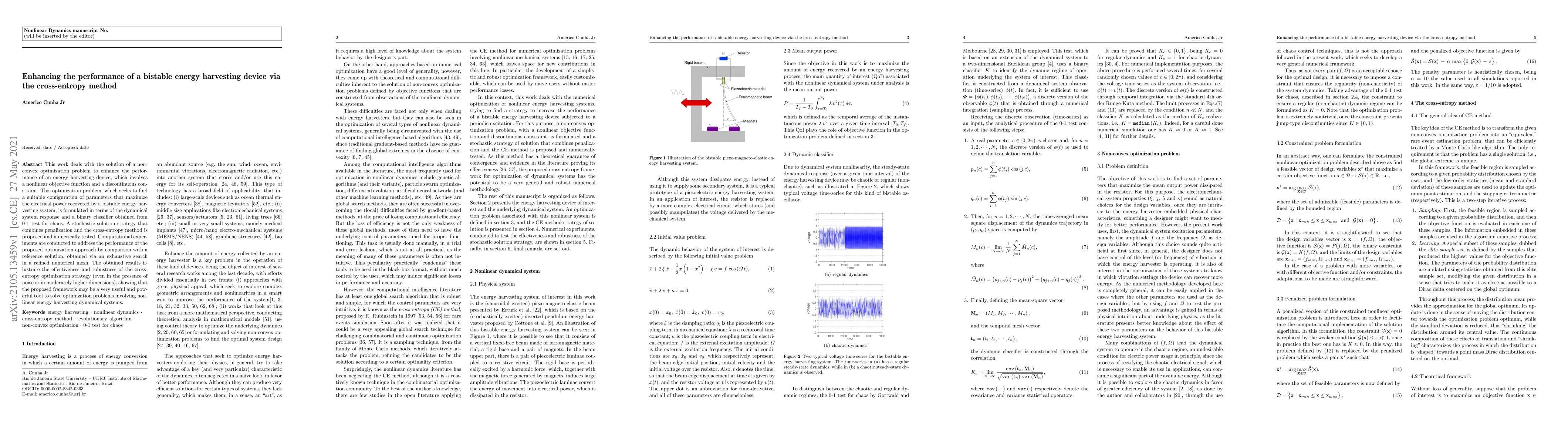 This work deals with the solution of a non-convex optimization problem to enhance the performance of an energy harvesting device, which involves a nonlinear objective function and a discontinuous constraint. This optimization problem, which seeks to find a suitable configuration of parameters that maximize the electrical power recovered by a bistable energy harvesting system, is formulated in terms of the dynamical system response and a binary classifier obtained from 0 to 1 test for chaos. A stochastic solution strategy that combines penalization and the cross-entropy method is proposed and numerically tested. Computational experiments are conducted to address the performance of the proposed optimization approach by comparison with a reference solution, obtained via an exhaustive search in a refined numerical mesh. The obtained results illustrate the effectiveness and robustness of the cross-entropy optimization strategy (even in the presence of noise or in moderately higher dimensions), showing that the proposed framework may be a very useful and powerful tool to solve optimization problems involving nonlinear energy harvesting dynamical systems.