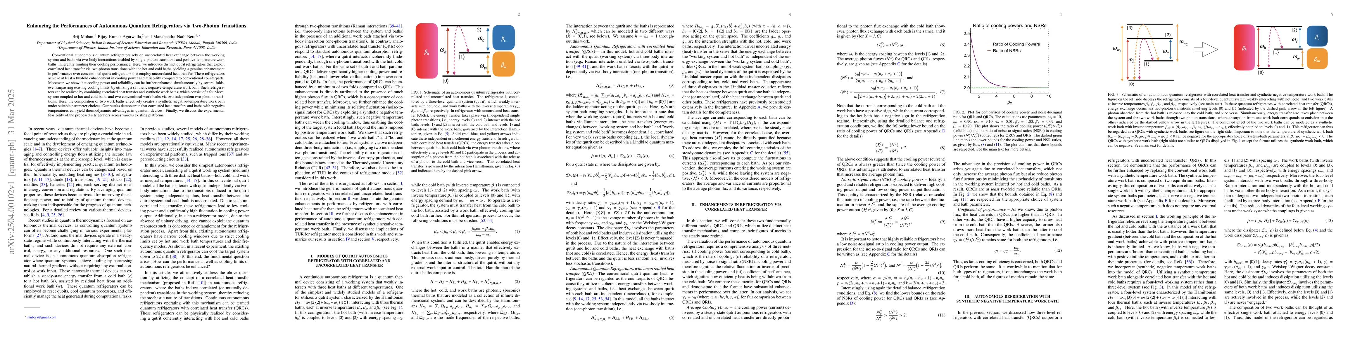 The research employs a theoretical framework based on quantum thermodynamics, analyzing autonomous quantum refrigerators using two-photon transitions for enhanced performance.