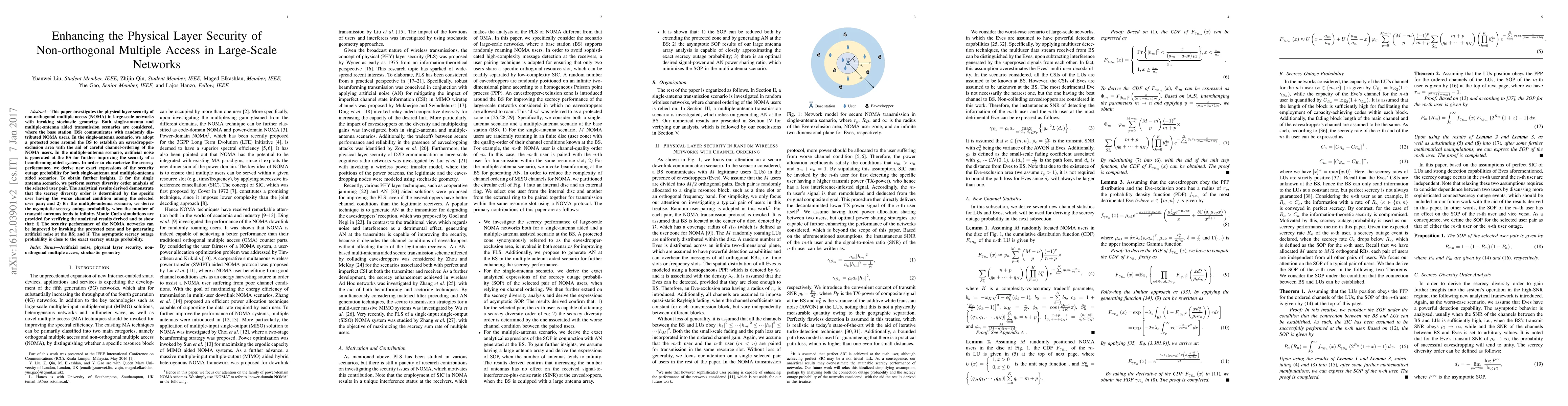This paper investigates physical layer security in NOMA for large-scale networks, employing stochastic geometry. It enhances security through a protected zone and artificial noise, deriving exact expressions for security outage probability and analyzing secrecy diversity and asymptotic behavior. Simulation results confirm improved security performance and validate analytical findings.