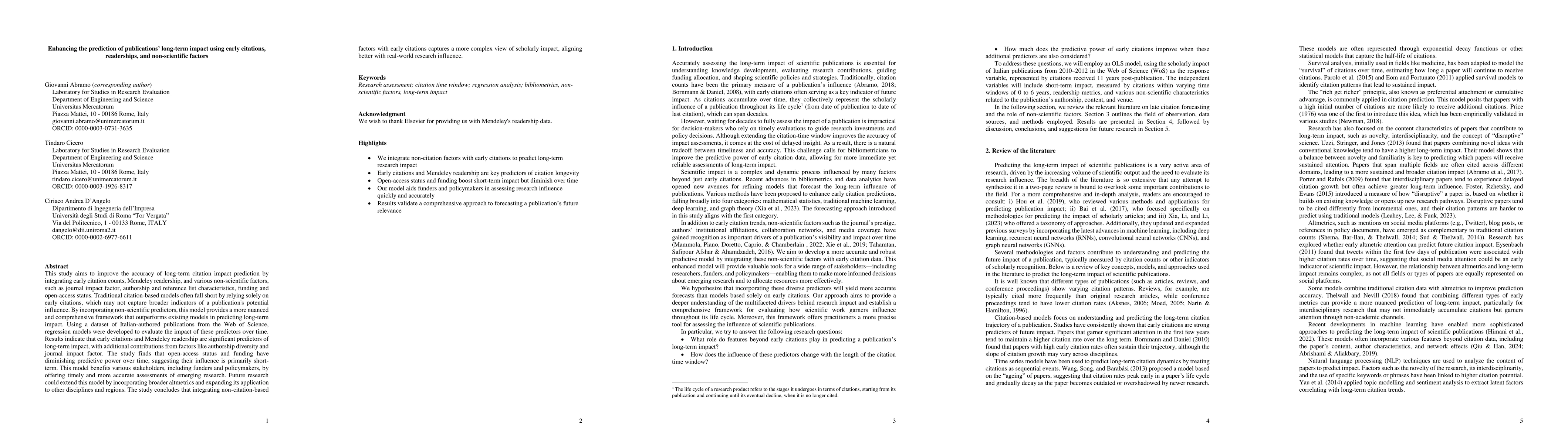 This study employed a mixed-methods approach, combining quantitative regression analysis with descriptive statistics to evaluate the predictive power of early citations, Mendeley readership, and non-scientific factors on long-term impact.