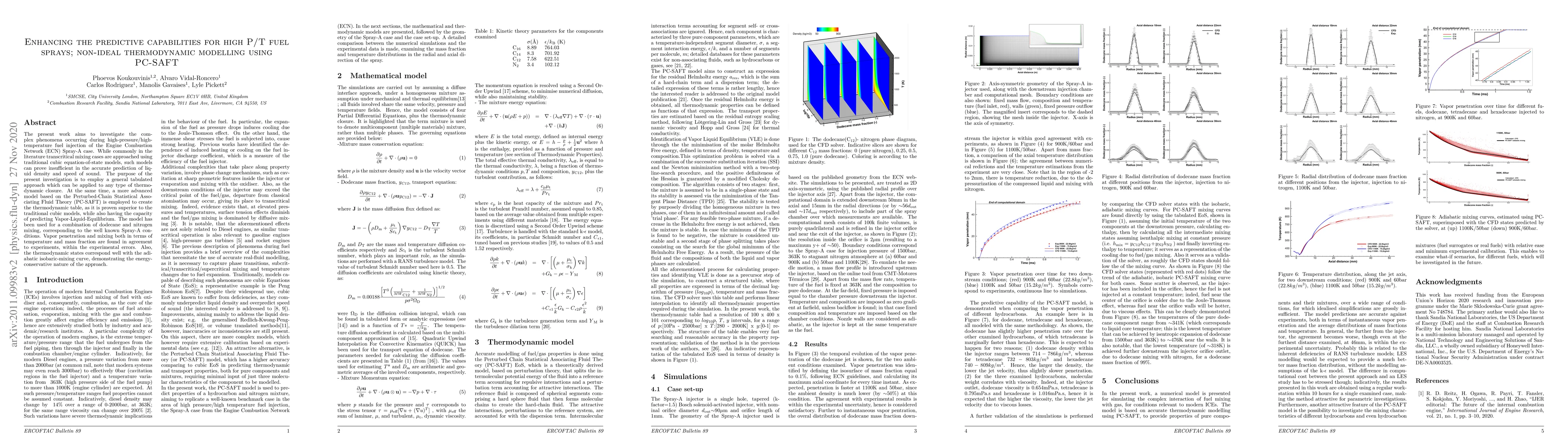 This paper investigates high-pressure/high-temperature fuel sprays using the PC-SAFT model for enhanced predictive capabilities, demonstrating superior accuracy over traditional cubic models in predicting liquid density and vapor-liquid equilibrium, and achieving good agreement with experimental results for Spray-A conditions.