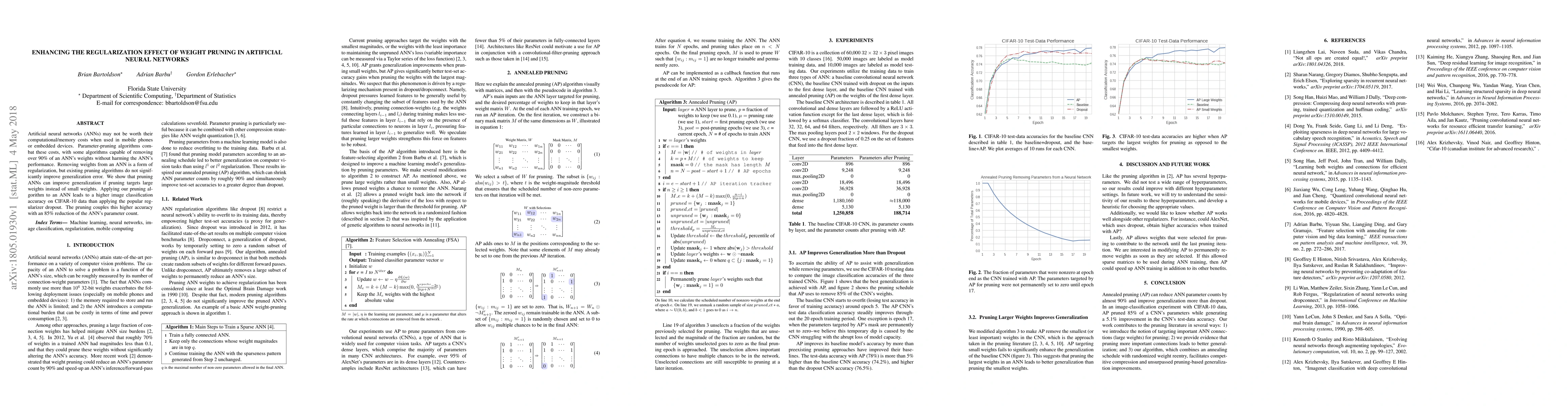 Artificial neural networks (ANNs) may not be worth their computational/memory costs when used in mobile phones or embedded devices. Parameter-pruning algorithms combat these costs, with some algorithms capable of removing over 90% of an ANN's weights without harming the ANN's performance. Removing weights from an ANN is a form of regularization, but existing pruning algorithms do not significantly improve generalization error. We show that pruning ANNs can improve generalization if pruning targets large weights instead of small weights. Applying our pruning algorithm to an ANN leads to a higher image classification accuracy on CIFAR-10 data than applying the popular regularizer dropout. The pruning couples this higher accuracy with an 85% reduction of the ANN's parameter count.