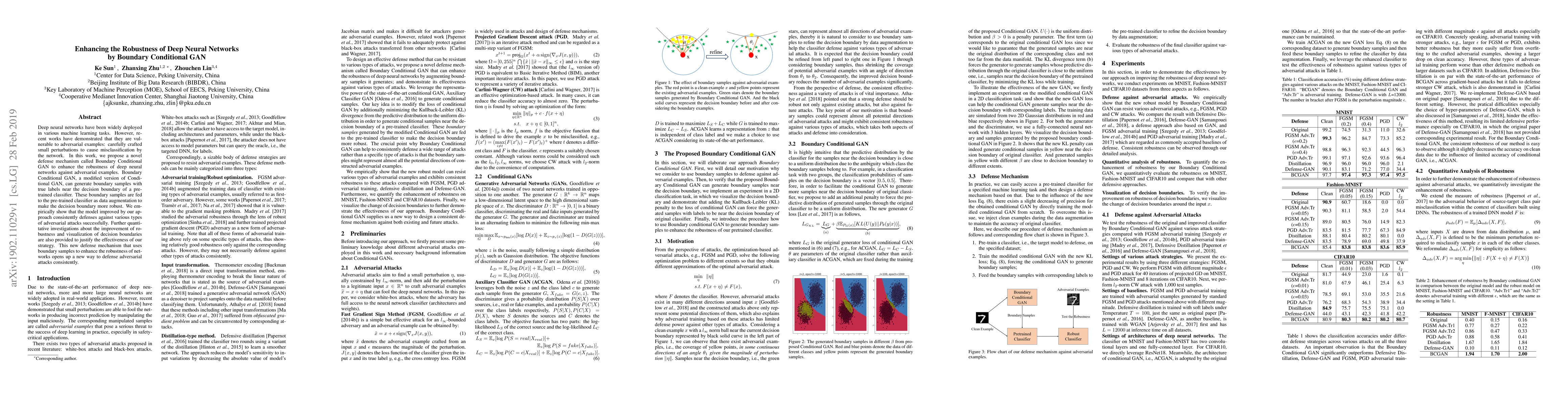 This paper proposes a Boundary Conditional GAN to enhance the robustness of deep neural networks against adversarial examples by generating boundary samples near the decision boundary for data augmentation. Empirical results show consistent defense against various adversarial attacks and improved robustness.