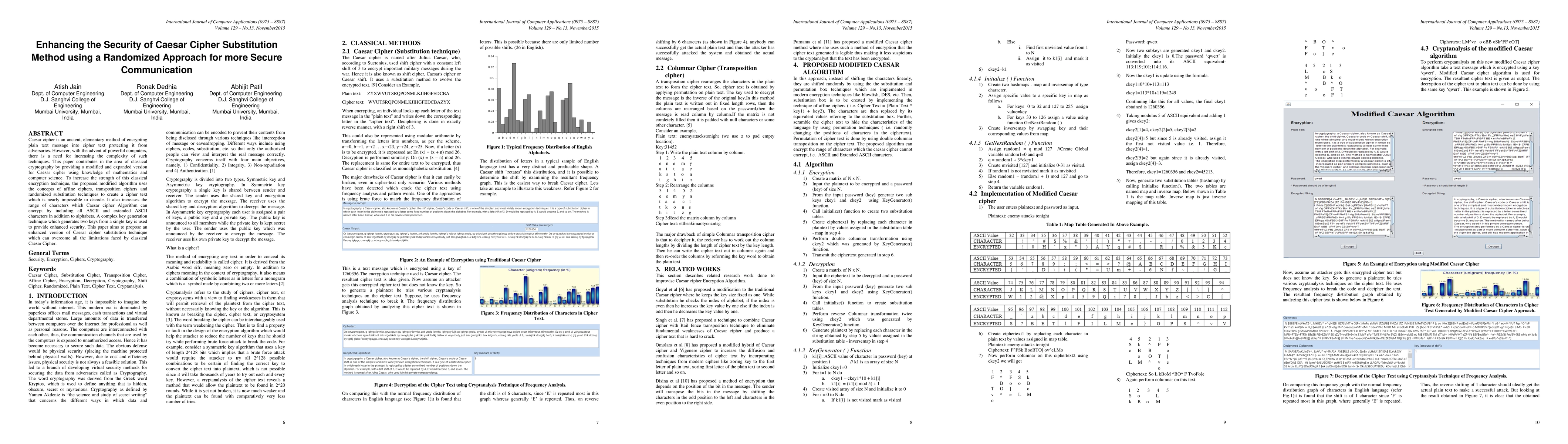 This paper proposes a modified Caesar cipher using affine, transposition, and randomized substitution techniques to enhance security. It expands the character set to include all ASCII and extended ASCII characters and introduces a complex key generation method to provide stronger encryption.
