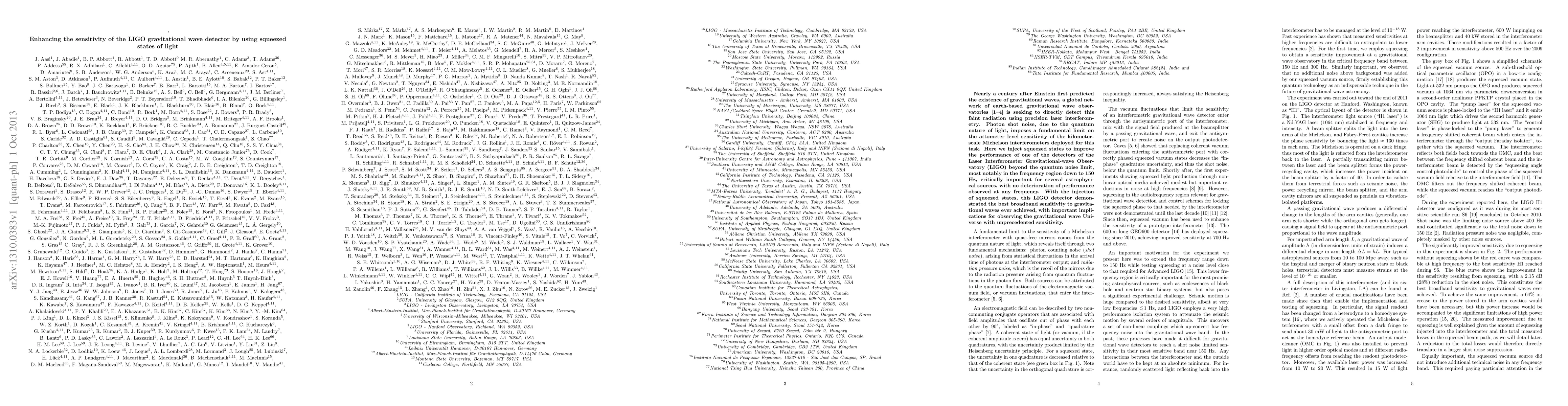 This paper discusses the use of squeezed states of light to enhance the sensitivity of LIGO's gravitational wave detectors, achieving unprecedented broadband sensitivity beyond the quantum noise limit, particularly in the 150 Hz frequency region, thus improving the observatory's ability to detect gravitational waves.