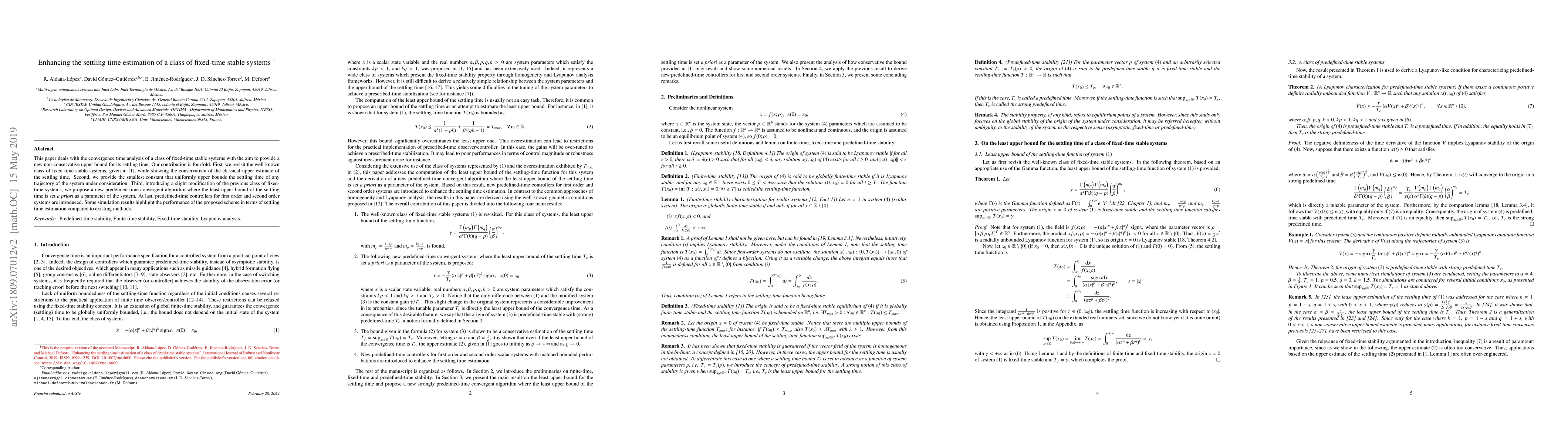 This paper deals with the convergence time analysis of a class of fixed-time stable systems with the aim to provide a new non-conservative upper bound for its settling time. Our contribution is fourfold. First, we revisit the well-known class of fixed-time stable systems, given in (Polyakov et al.,2012}, while showing the conservatism of the classical upper estimate of the settling time. Second, we provide the smallest constant that uniformly upper bounds the settling time of any trajectory of the system under consideration. Third, introducing a slight modification of the previous class of fixed-time systems, we propose a new predefined-time convergent algorithm where the least upper bound of the settling time is set a priori as a parameter of the system. At last, predefined-time controllers for first order and second order systems are introduced. Some simulation results highlight the performance of the proposed scheme in terms of settling time estimation compared to existing methods.