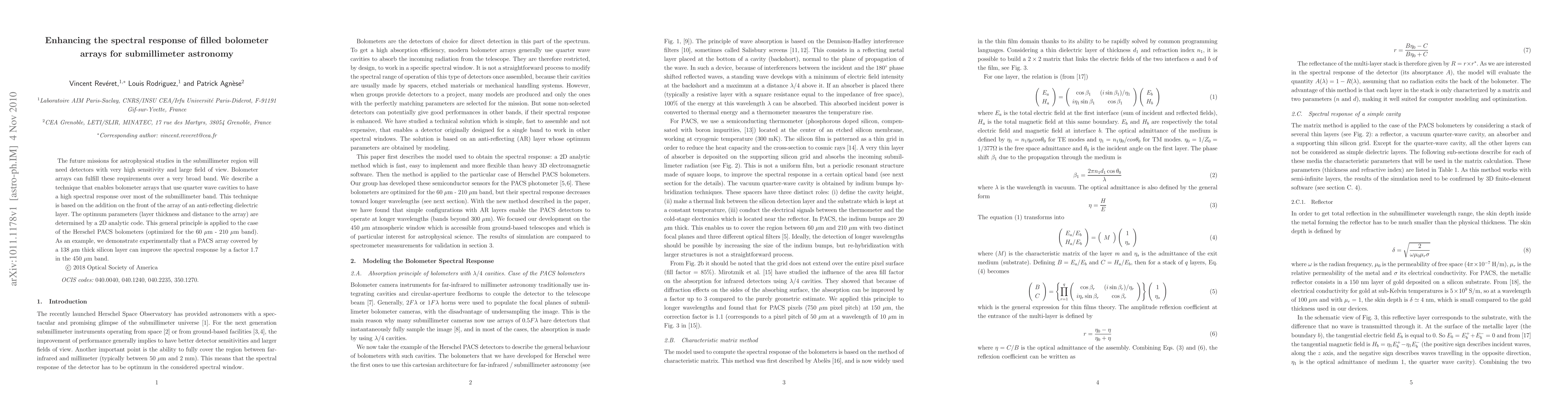 This paper proposes a method to enhance the spectral response of bolometer arrays for submillimeter astronomy using an anti-reflecting dielectric layer. Experimental results show a 1.7-fold improvement in spectral response for a Herschel PACS bolometer array with a 138 micron thick silicon layer.