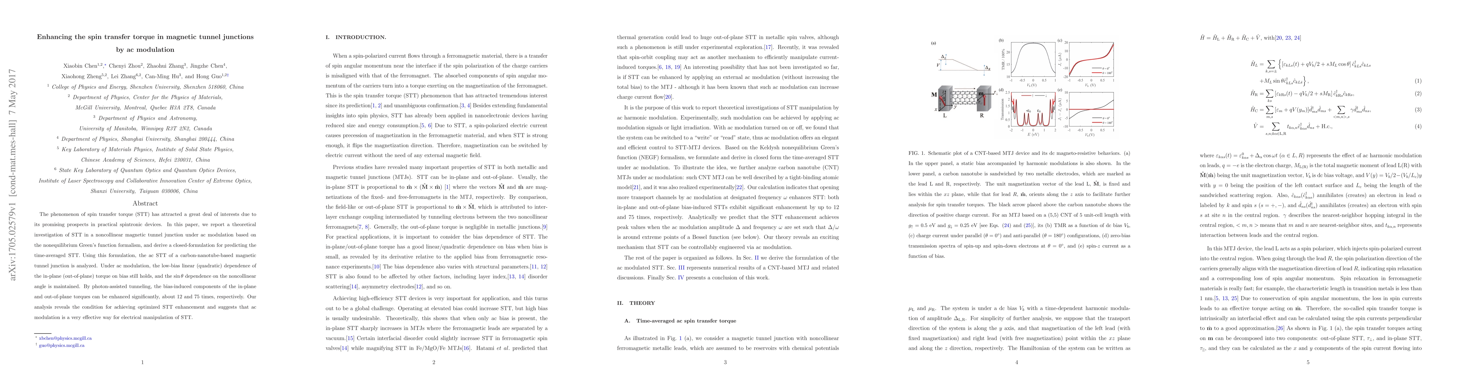 The phenomenon of spin transfer torque (STT) has attracted a great deal of interests due to its promising prospects in practical spintronic devices. In this paper, we report a theoretical investigation of STT in a noncollinear magnetic tunnel junction under ac modulation based on the nonequilibrium Green's function formalism, and derive a closed-formulation for predicting the time-averaged STT. Using this formulation, the ac STT of a carbon-nanotube-based magnetic tunnel junction is analyzed. Under ac modulation, the low-bias linear (quadratic) dependence of the in-plane (out-of-plane) torque on bias still holds, and the $\sin\theta$ dependence on the noncollinear angle is maintained. By photon-assisted tunneling, the bias-induced components of the in-plane and out-of-plane torques can be enhanced significantly, about 12 and 75 times, respectively. Our analysis reveals the condition for achieving optimized STT enhancement and suggests that ac modulation is a very effective way for electrical manipulation of STT.