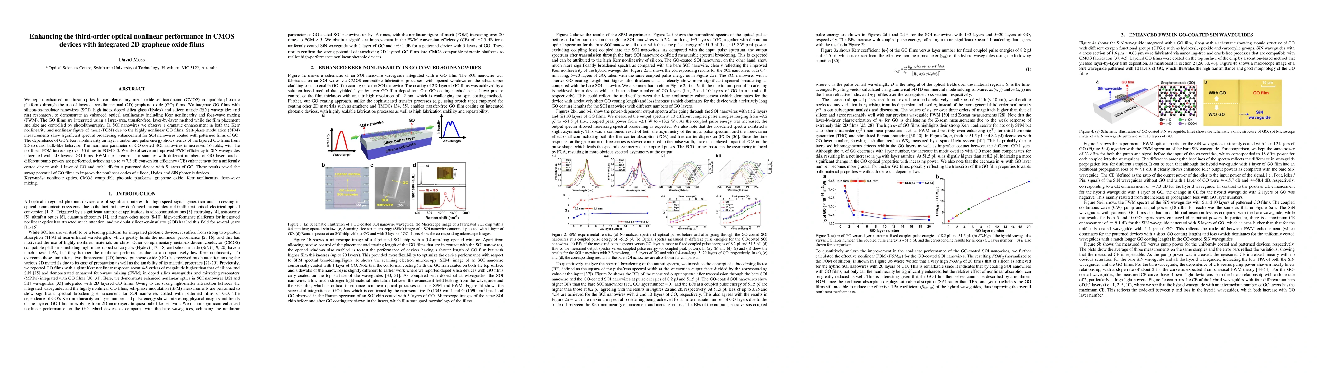 This research demonstrates significantly enhanced third-order optical nonlinearity in CMOS photonic platforms by integrating layered two-dimensional graphene oxide (GO) films into silicon on insulator nanowires, high index doped silica glass, and silicon nitride waveguides. The study shows a 16-fold increase in the nonlinear parameter and over 20 times improvement in nonlinear figure of merit, along with notable enhancements in four wave mixing efficiency.