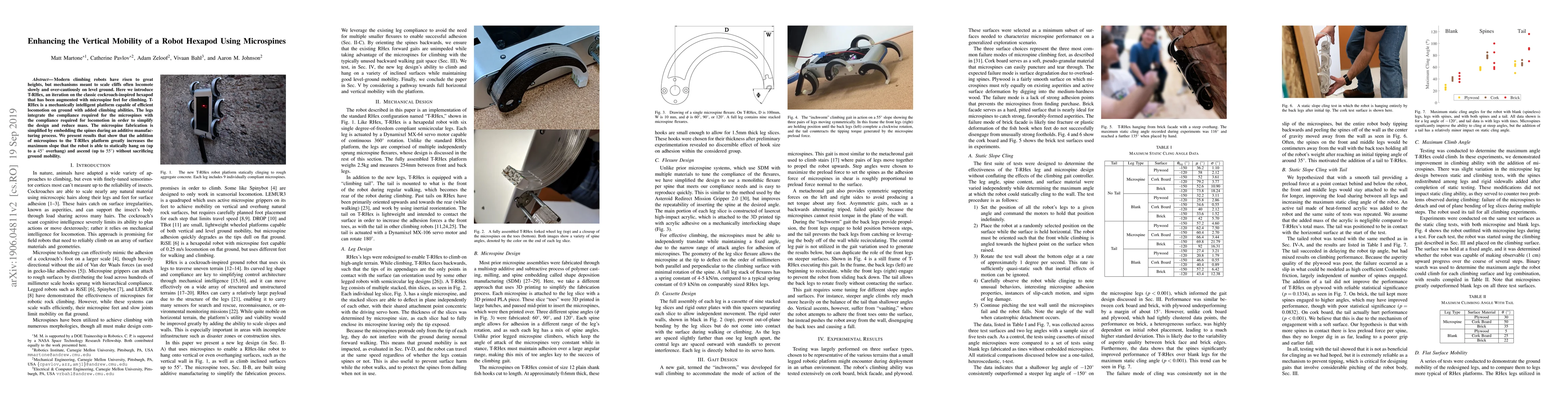 The research introduces T-RHex, an iteration of the classic cockroach-inspired hexapod robot, enhanced with microspine feet for climbing. The microspines are integrated during an additive manufacturing process, simplifying fabrication. Leg compliance is leveraged to avoid the need for multiple smaller flexure points for adhesion.