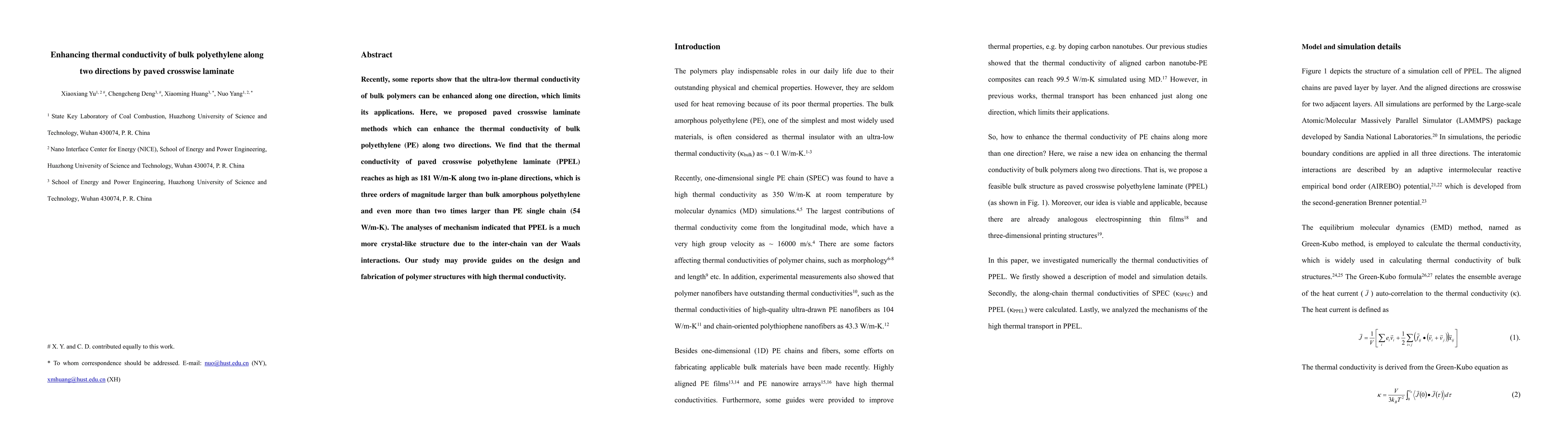 This study proposes a paved crosswise laminate method to significantly enhance the thermal conductivity of bulk polyethylene along two directions, achieving up to 181 W/m-K. The improved thermal conductivity is attributed to a more crystal-like structure from inter-chain van der Waals interactions, providing a new approach for designing high-conductivity polymer materials.