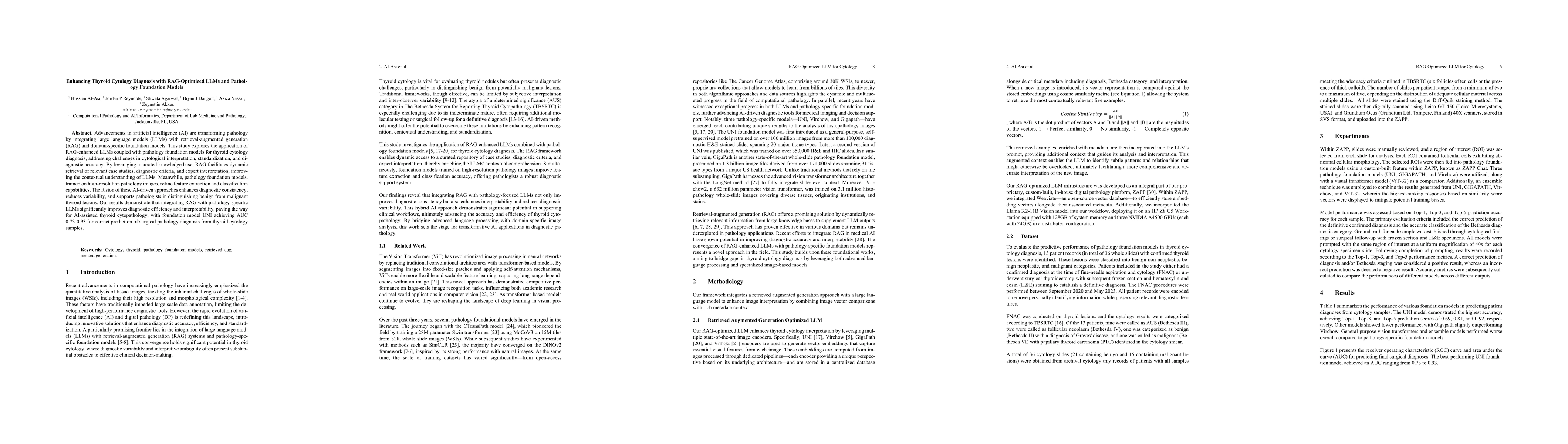 Advancements in artificial intelligence (AI) are transforming pathology by integrat-ing large language models (LLMs) with retrieval-augmented generation (RAG) and domain-specific foundation models. This study explores the application of RAG-enhanced LLMs coupled with pathology foundation models for thyroid cytology diagnosis, addressing challenges in cytological interpretation, standardization, and diagnostic accuracy. By leveraging a curated knowledge base, RAG facilitates dy-namic retrieval of relevant case studies, diagnostic criteria, and expert interpreta-tion, improving the contextual understanding of LLMs. Meanwhile, pathology foun-dation models, trained on high-resolution pathology images, refine feature extrac-tion and classification capabilities. The fusion of these AI-driven approaches en-hances diagnostic consistency, reduces variability, and supports pathologists in dis-tinguishing benign from malignant thyroid lesions. Our results demonstrate that integrating RAG with pathology-specific LLMs significantly improves diagnostic efficiency and interpretability, paving the way for AI-assisted thyroid cytopathology, with foundation model UNI achieving AUC 0.73-0.93 for correct prediction of surgi-cal pathology diagnosis from thyroid cytology samples.