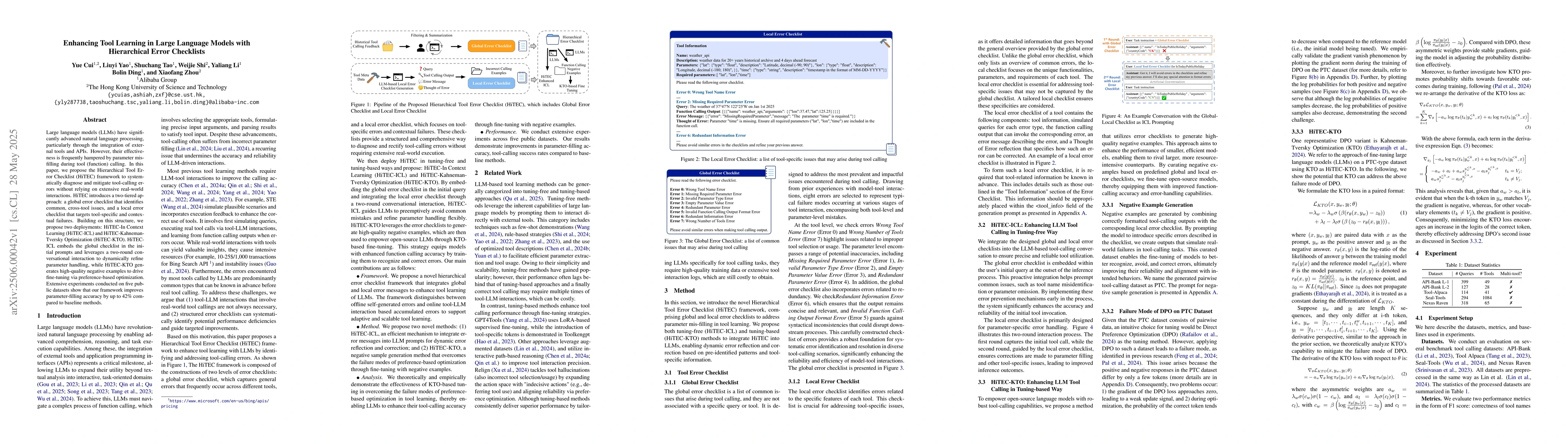 The paper proposes the Hierarchical Tool Error Checklist (HiTEC) framework, which systematically diagnoses and mitigates tool-calling errors in large language models (LLMs) using a two-tiered approach: a global error checklist for cross-tool issues and a local error checklist for tool-specific and contextual failures. Two deployments, HiTEC-In Context Learning (HiTEC-ICL) and HiTEC-Kahneman-Tversky Optimization (HiTEC-KTO), are introduced to refine parameter handling and drive fine-tuning via preference-based optimization.