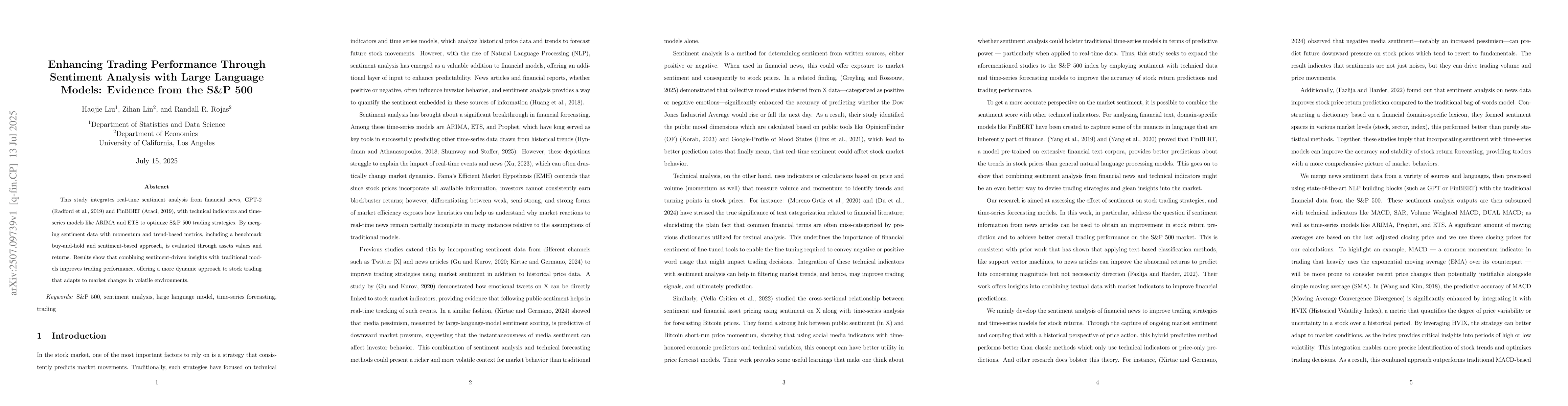 The study integrates real-time sentiment analysis from financial news using GPT-2 and FinBERT with traditional technical indicators and time-series models like ARIMA and ETS to optimize S&P 500 trading strategies.