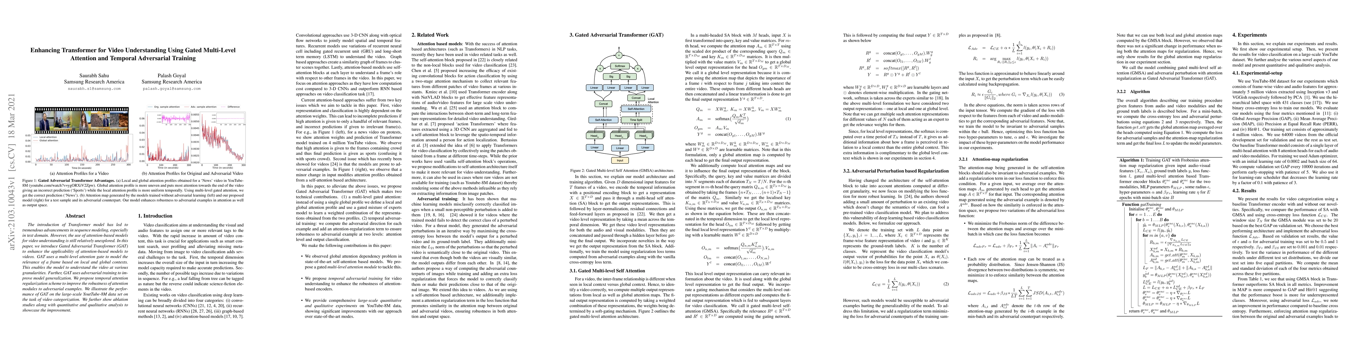 The paper presents Gated Adversarial Transformer (GAT), which incorporates gated multi-level self-attention and adversarial training for video understanding, introducing temporal attention regularization to enhance robustness.