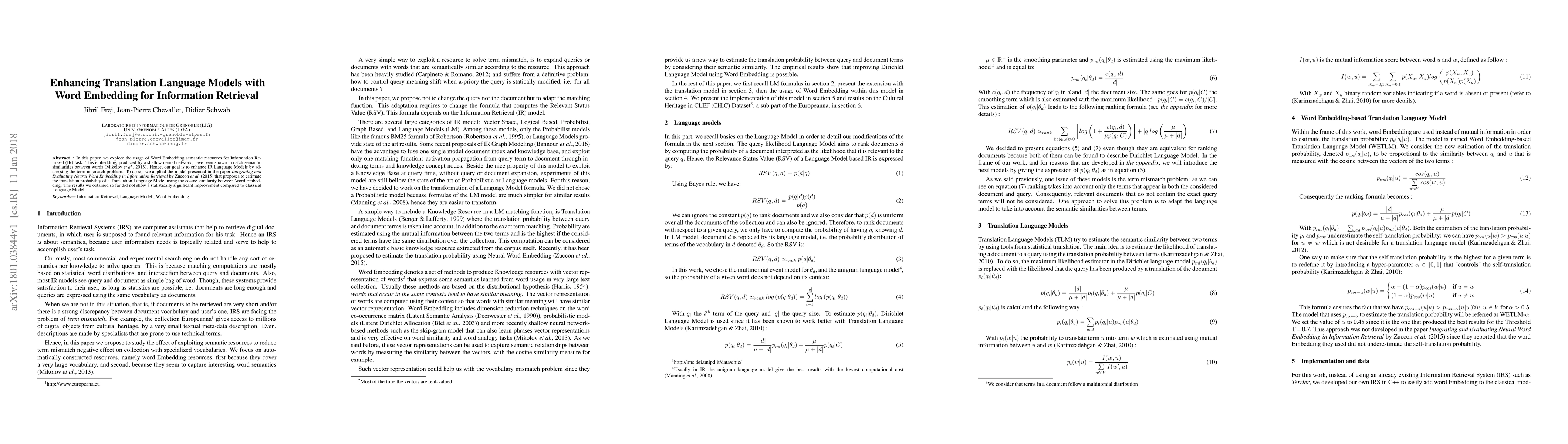 In this paper, we explore the usage of Word Embedding semantic resources for Information Retrieval (IR) task. This embedding, produced by a shallow neural network, have been shown to catch semantic similarities between words (Mikolov et al., 2013). Hence, our goal is to enhance IR Language Models by addressing the term mismatch problem. To do so, we applied the model presented in the paper Integrating and Evaluating Neural Word Embedding in Information Retrieval by Zuccon et al. (2015) that proposes to estimate the translation probability of a Translation Language Model using the cosine similarity between Word Embedding. The results we obtained so far did not show a statistically significant improvement compared to classical Language Model.