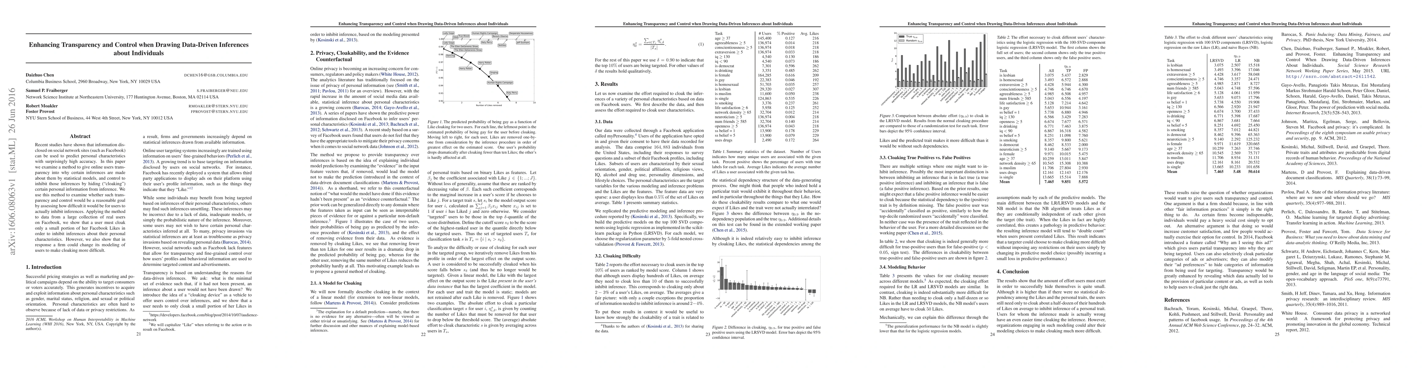 Recent studies have shown that information disclosed on social network sites (such as Facebook) can be used to predict personal characteristics with surprisingly high accuracy. In this paper we examine a method to give online users transparency into why certain inferences are made about them by statistical models, and control to inhibit those inferences by hiding ("cloaking") certain personal information from inference. We use this method to examine whether such transparency and control would be a reasonable goal by assessing how difficult it would be for users to actually inhibit inferences. Applying the method to data from a large collection of real users on Facebook, we show that a user must cloak only a small portion of her Facebook Likes in order to inhibit inferences about their personal characteristics. However, we also show that in response a firm could change its modeling of users to make cloaking more difficult.
