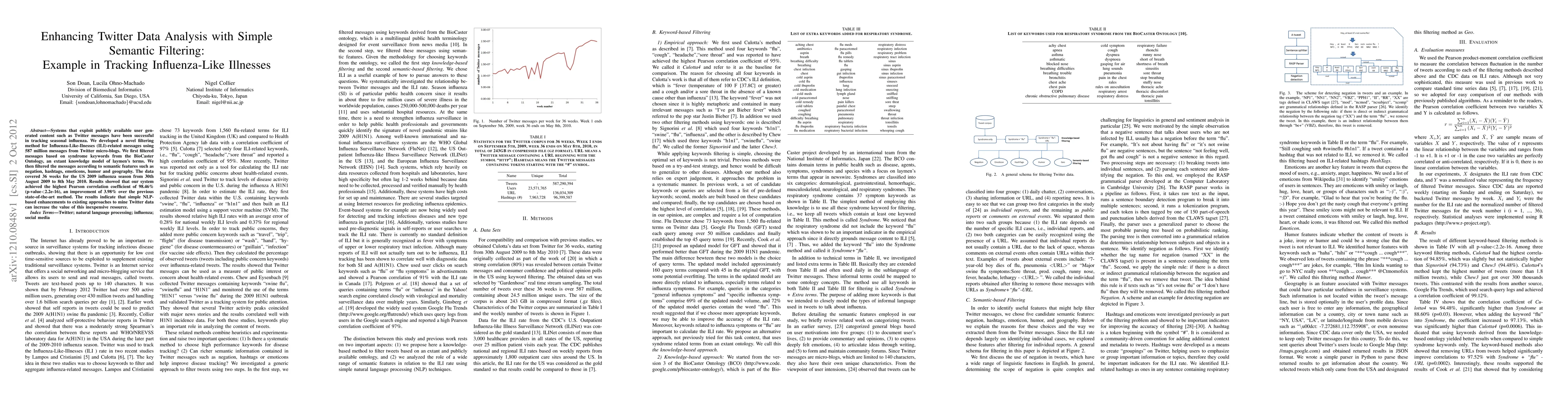 Systems that exploit publicly available user generated content such as Twitter messages have been successful in tracking seasonal influenza. We developed a novel filtering method for Influenza-Like-Illnesses (ILI)-related messages using 587 million messages from Twitter micro-blogs. We first filtered messages based on syndrome keywords from the BioCaster Ontology, an extant knowledge model of laymen's terms. We then filtered the messages according to semantic features such as negation, hashtags, emoticons, humor and geography. The data covered 36 weeks for the US 2009 influenza season from 30th August 2009 to 8th May 2010. Results showed that our system achieved the highest Pearson correlation coefficient of 98.46% (p-value<2.2e-16), an improvement of 3.98% over the previous state-of-the-art method. The results indicate that simple NLP-based enhancements to existing approaches to mine Twitter data can increase the value of this inexpensive resource.