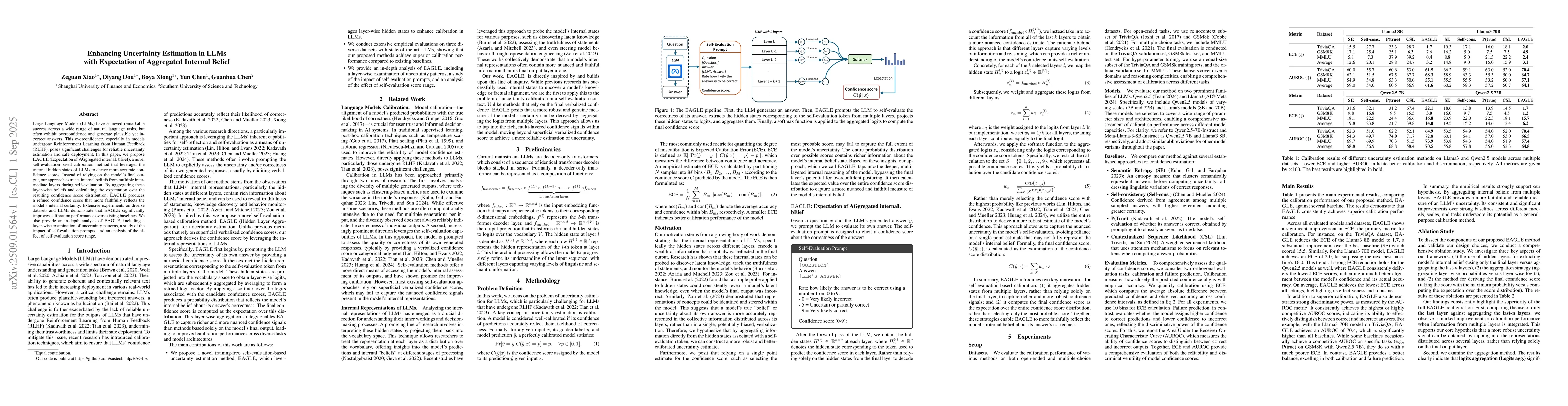 Large Language Models (LLMs) have achieved remarkable success across a wide range of natural language tasks, but often exhibit overconfidence and generate plausible yet incorrect answers. This overconfidence, especially in models undergone Reinforcement Learning from Human Feedback (RLHF), poses significant challenges for reliable uncertainty estimation and safe deployment. In this paper, we propose EAGLE (Expectation of AGgregated internaL bEief), a novel self-evaluation-based calibration method that leverages the internal hidden states of LLMs to derive more accurate confidence scores. Instead of relying on the model's final output, our approach extracts internal beliefs from multiple intermediate layers during self-evaluation. By aggregating these layer-wise beliefs and calculating the expectation over the resulting confidence score distribution, EAGLE produces a refined confidence score that more faithfully reflects the model's internal certainty. Extensive experiments on diverse datasets and LLMs demonstrate that EAGLE significantly improves calibration performance over existing baselines. We also provide an in-depth analysis of EAGLE, including a layer-wise examination of uncertainty patterns, a study of the impact of self-evaluation prompts, and an analysis of the effect of self-evaluation score range.