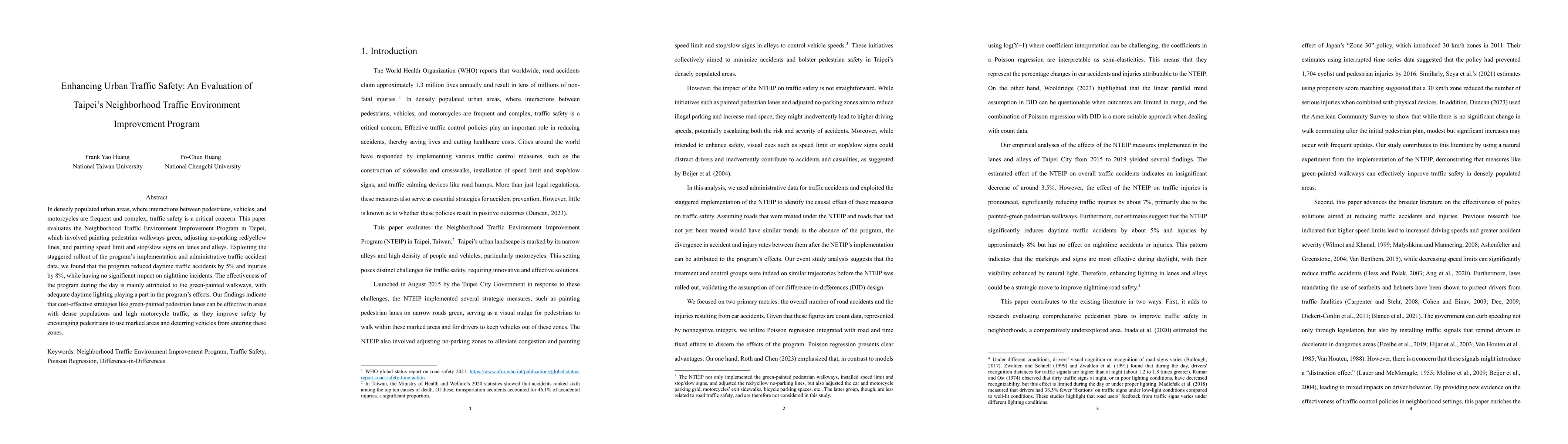 This study evaluates Taipei's Neighborhood Traffic Environment Improvement Program, finding a 5% reduction in daytime traffic accidents and an 8% decrease in injuries, primarily due to painted green pedestrian paths. The program had no significant impact on nighttime incidents, highlighting the effectiveness of cost-efficient measures in densely populated urban areas.