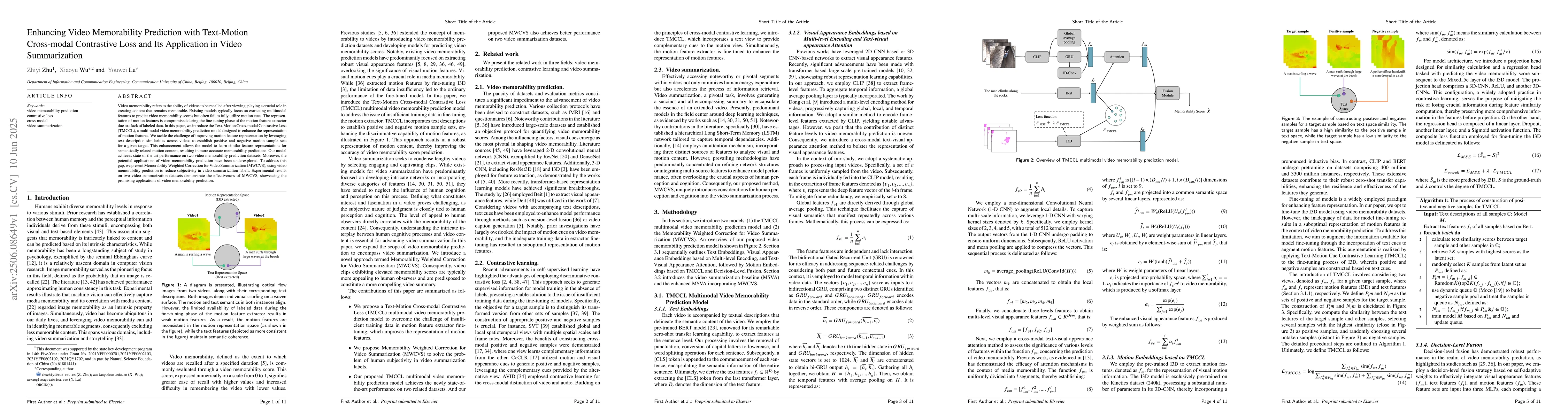 A new model enhances video memorability prediction using text-motion contrastive loss, achieving state-of-the-art performance on two datasets, and demonstrating potential applications in video summarization.