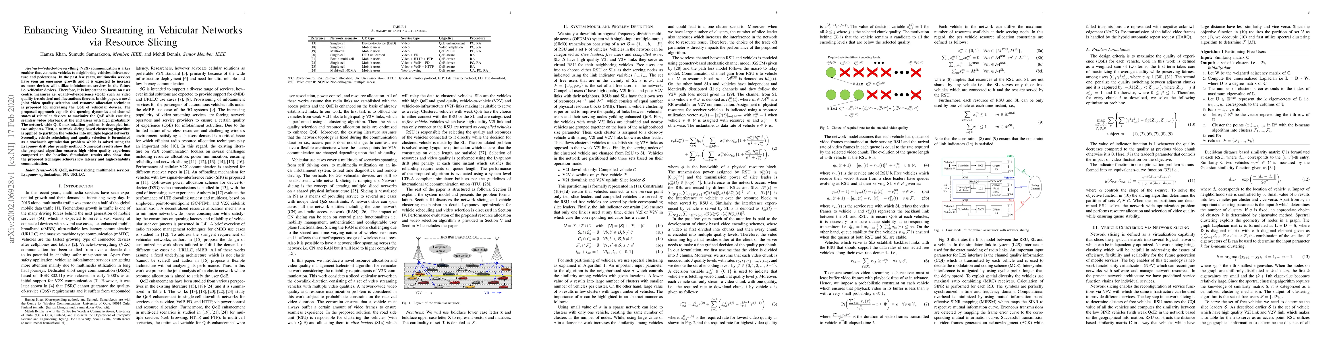 This paper proposes a novel technique for enhancing video streaming in vehicular networks by employing resource slicing and network slicing to maximize quality-of-experience (QoE) through optimal video quality selection and resource allocation. The method achieves high video quality and low latency by decoupling the network-wide QoE maximization problem into a clustering algorithm and a stochastic optimization problem solved via Lyapunov drift plus penalty.