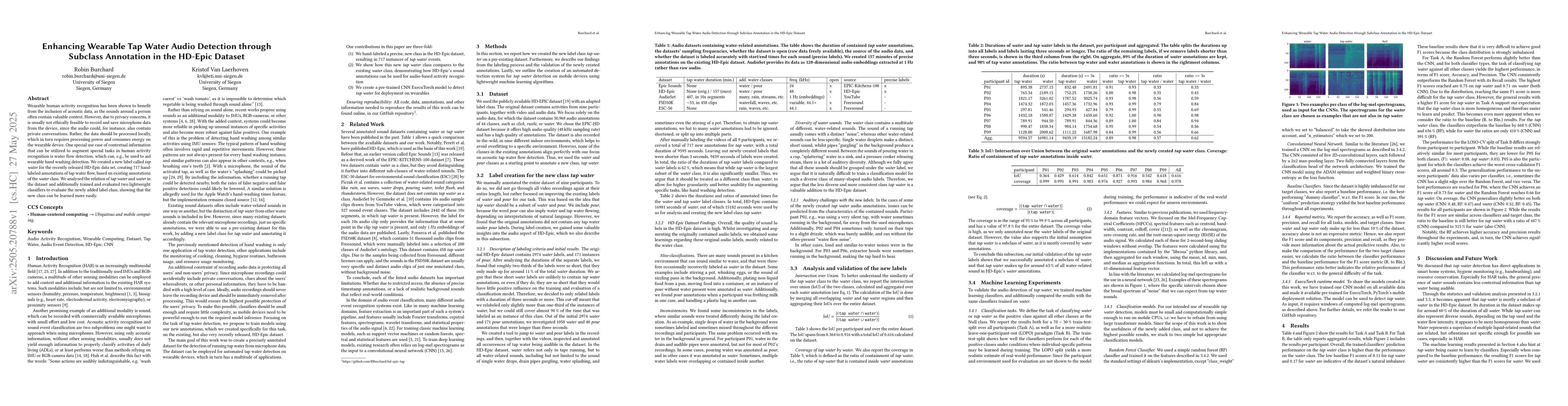 Wearable human activity recognition has been shown to benefit from the inclusion of acoustic data, as the sounds around a person often contain valuable context. However, due to privacy concerns, it is usually not ethically feasible to record and save microphone data from the device, since the audio could, for instance, also contain private conversations. Rather, the data should be processed locally, which in turn requires processing power and consumes energy on the wearable device. One special use case of contextual information that can be utilized to augment special tasks in human activity recognition is water flow detection, which can, e.g., be used to aid wearable hand washing detection. We created a new label called tap water for the recently released HD-Epic data set, creating 717 hand-labeled annotations of tap water flow, based on existing annotations of the water class. We analyzed the relation of tap water and water in the dataset and additionally trained and evaluated two lightweight classifiers to evaluate the newly added label class, showing that the new class can be learned more easily.