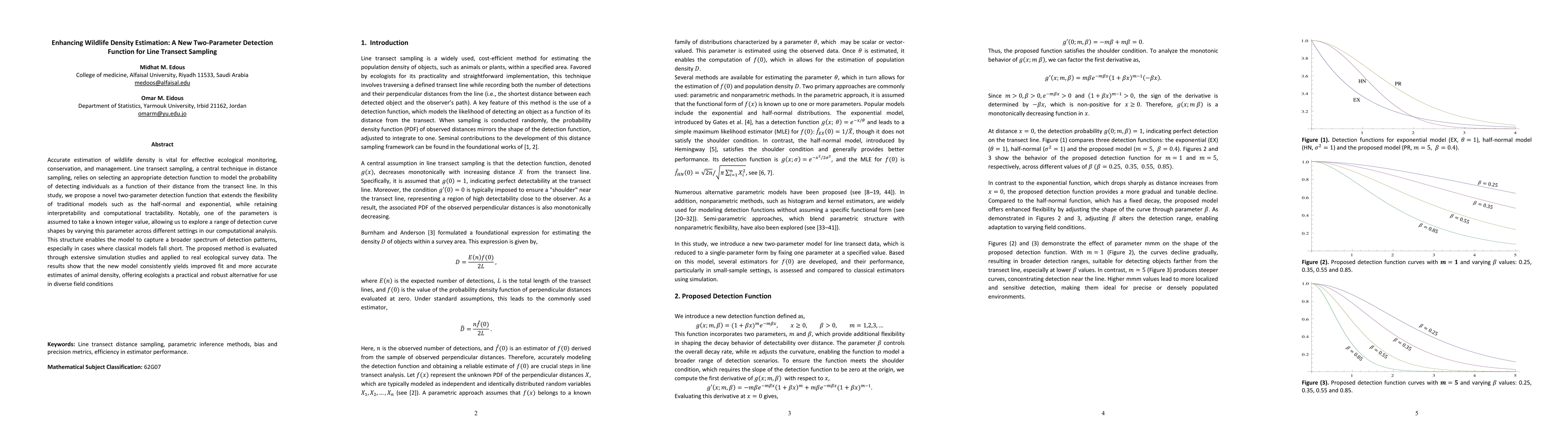 Accurate estimation of wildlife density is vital for effective ecological monitoring, conservation, and management. Line transect sampling, a central technique in distance sampling, relies on selecting an appropriate detection function to model the probability of detecting individuals as a function of their distance from the transect line. In this study, we propose a novel two-parameter detection function that extends the flexibility of traditional models such as the half-normal and exponential, while retaining interpretability and computational tractability. Notably, one of the parameters is assumed to take a known integer value, allowing us to explore a range of detection curve shapes by varying this parameter across different settings in our computational analysis. This structure enables the model to capture a broader spectrum of detection patterns, especially in cases where classical models fall short. The proposed method is evaluated through extensive simulation studies and applied to real ecological survey data. The results show that the new model consistently yields improved fit and more accurate estimates of animal density, offering ecologists a practical and robust alternative for use in diverse field conditions