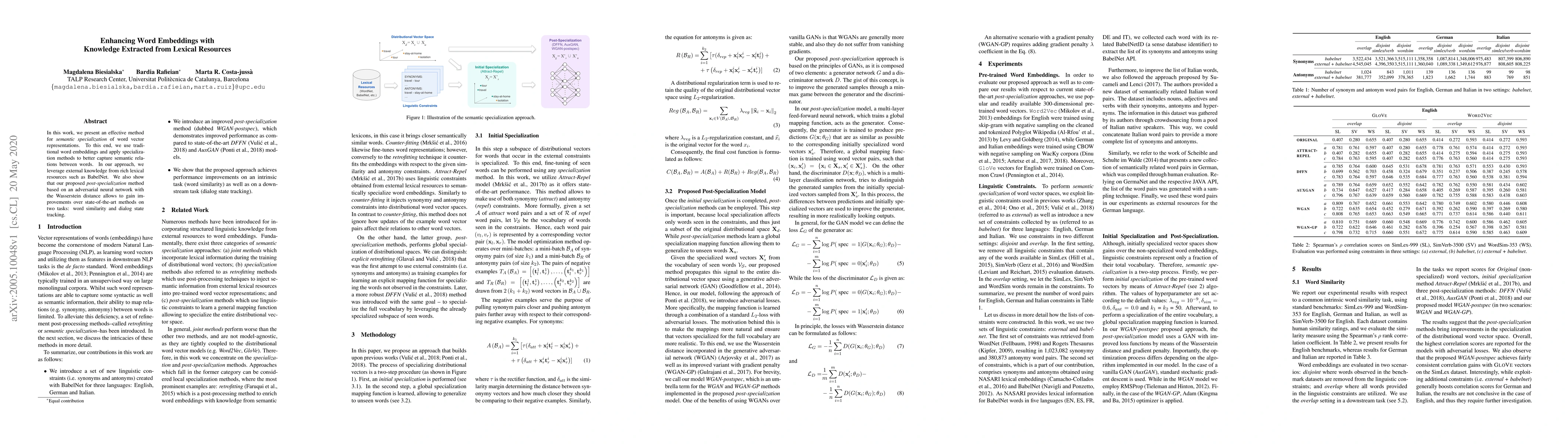 This paper proposes a method to enhance word embeddings by integrating specialized knowledge from lexical resources like BabelNet, achieving better semantic relations. The use of an adversarial neural network with Wasserstein distance further improves performance on word similarity and dialog state tracking tasks.