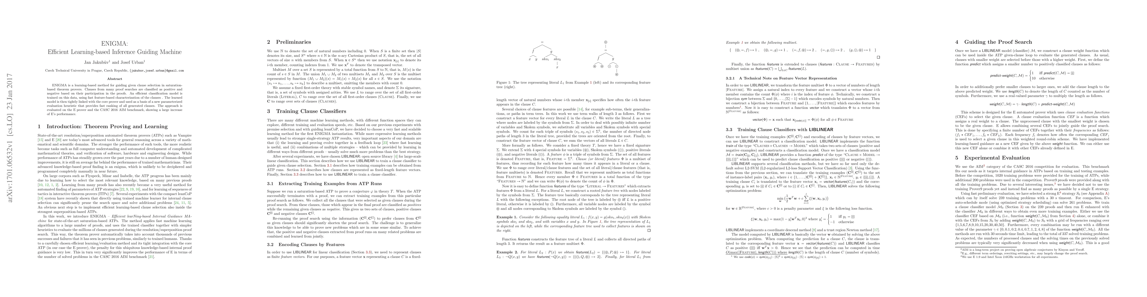 ENIGMA is a learning-based method for guiding given clause selection in saturation-based theorem provers. Clauses from many proof searches are classified as positive and negative based on their participation in the proofs. An efficient classification model is trained on this data, using fast feature-based characterization of the clauses . The learned model is then tightly linked with the core prover and used as a basis of a new parameterized evaluation heuristic that provides fast ranking of all generated clauses. The approach is evaluated on the E prover and the CASC 2016 AIM benchmark, showing a large increase of E's performance.