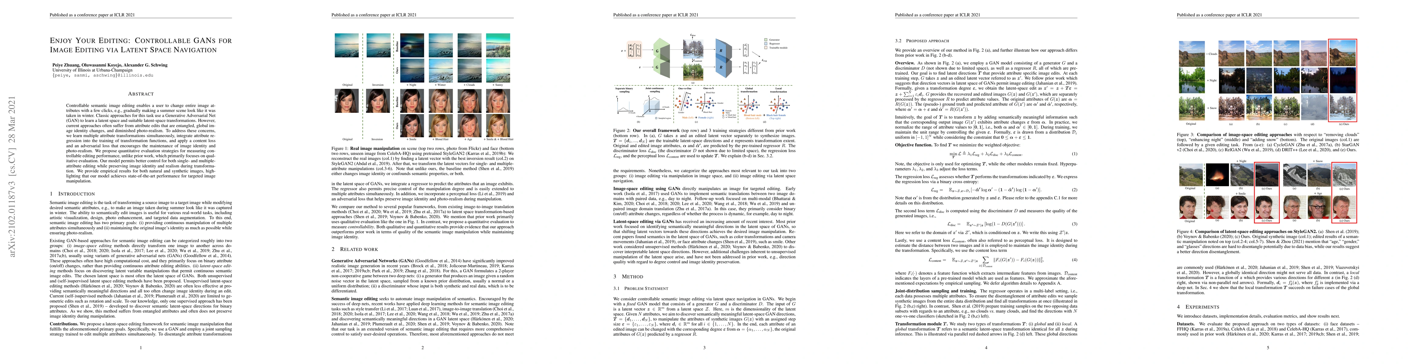 Controllable semantic image editing enables a user to change entire image attributes with a few clicks, e.g., gradually making a summer scene look like it was taken in winter. Classic approaches for this task use a Generative Adversarial Net (GAN) to learn a latent space and suitable latent-space transformations. However, current approaches often suffer from attribute edits that are entangled, global image identity changes, and diminished photo-realism. To address these concerns, we learn multiple attribute transformations simultaneously, integrate attribute regression into the training of transformation functions, and apply a content loss and an adversarial loss that encourages the maintenance of image identity and photo-realism. We propose quantitative evaluation strategies for measuring controllable editing performance, unlike prior work, which primarily focuses on qualitative evaluation. Our model permits better control for both single- and multiple-attribute editing while preserving image identity and realism during transformation. We provide empirical results for both natural and synthetic images, highlighting that our model achieves state-of-the-art performance for targeted image manipulation.