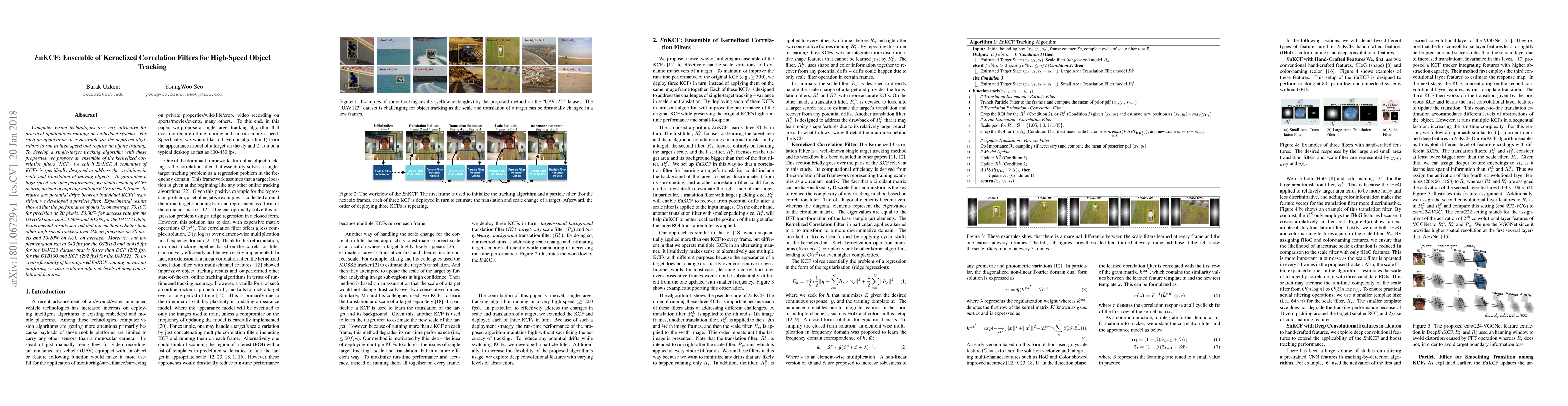 The EnKCF algorithm proposes an ensemble of kernelized correlation filters for high-speed object tracking without offline training. It achieves superior performance and speed, running at 340 fps on OTB100 and 416 fps on UAV123, outperforming other trackers by over 5% in precision and 10-20% in AUC.